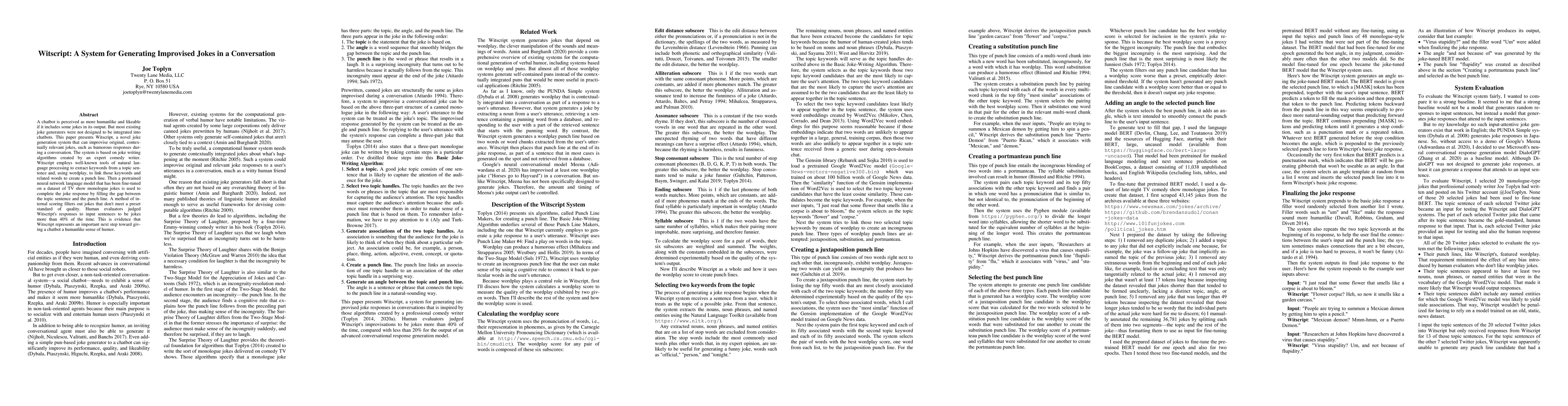Witscript is a novel joke generation system designed to create improvised, contextually relevant jokes for chatbots, employing NLP tools and a fine-tuned neural network to generate punch lines. Human evaluators found its jokes to be funny over 40% of the time, indicating its potential to enhance chatbot humor.