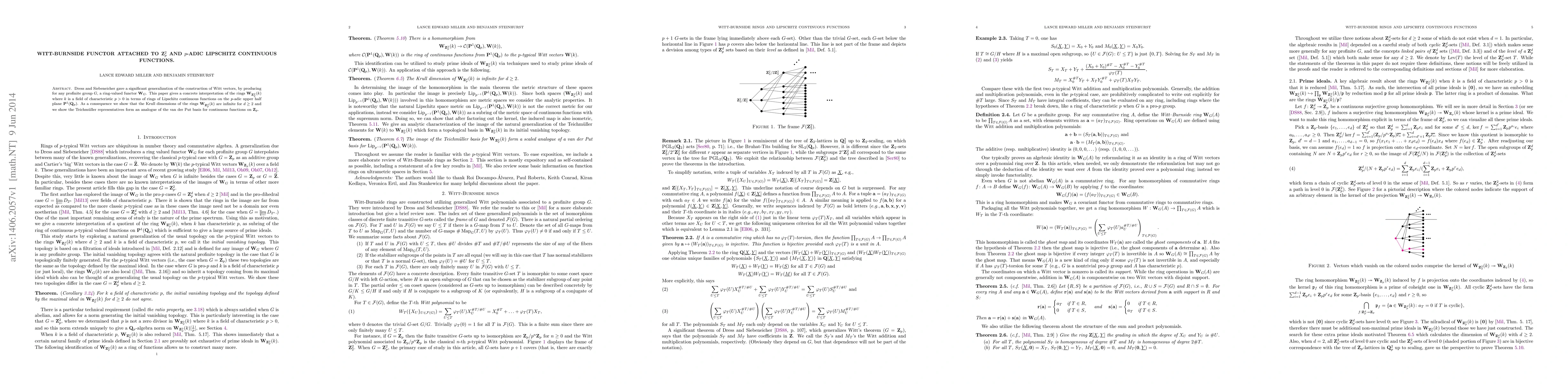 This paper interprets Witt-Burnside functors associated with $\mathbf{Z}_p^2$ in terms of rings of $p$-adic Lipschitz continuous functions on the $p$-adic upper half plane, demonstrating infinite Krull dimensions for $d \geq 2$ and linking Teichmüller representatives to a $p$-adic analogue of the van der Put basis.