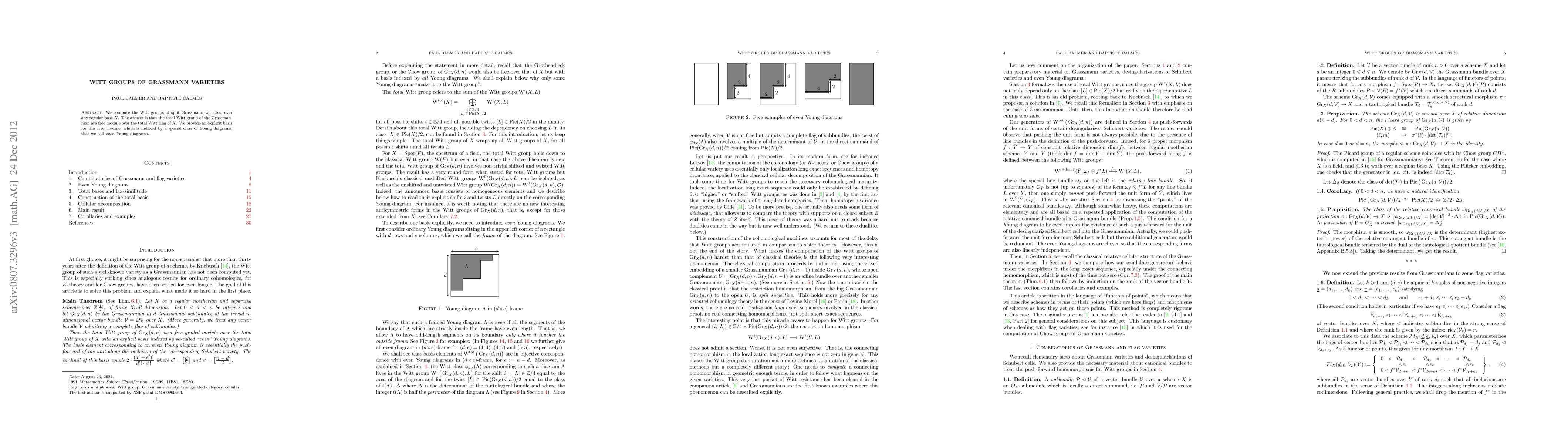 The paper computes the total Witt groups of split Grassmann varieties over any regular base, revealing them as a free module over the total Witt ring of the base. An explicit basis for this module is provided, characterized by a class of Young diagrams termed "even Young diagrams."