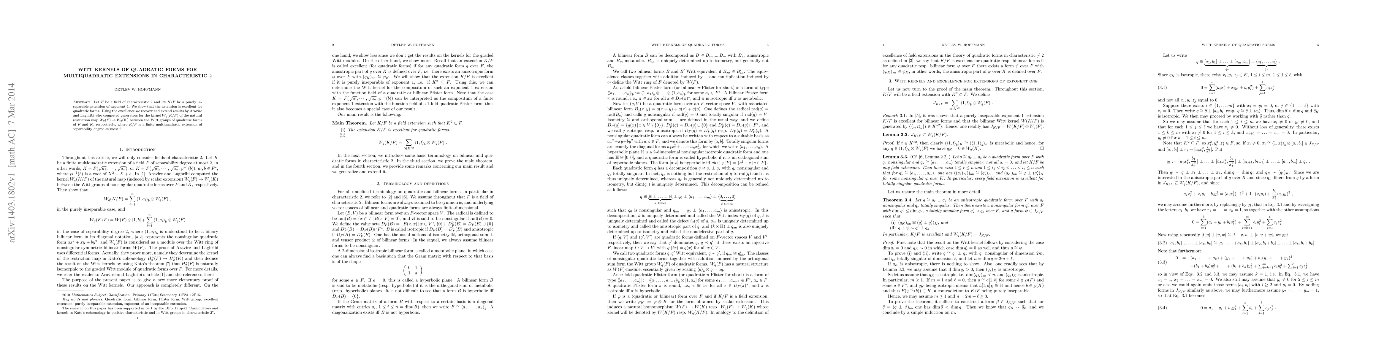 Summary: The paper demonstrates that purely inseparable extensions of exponent 1 in fields of characteristic 2 are excellent for quadratic forms, and extends previous results on the Witt kernel generators for finite multiquadratic extensions of degree ≤ 2.