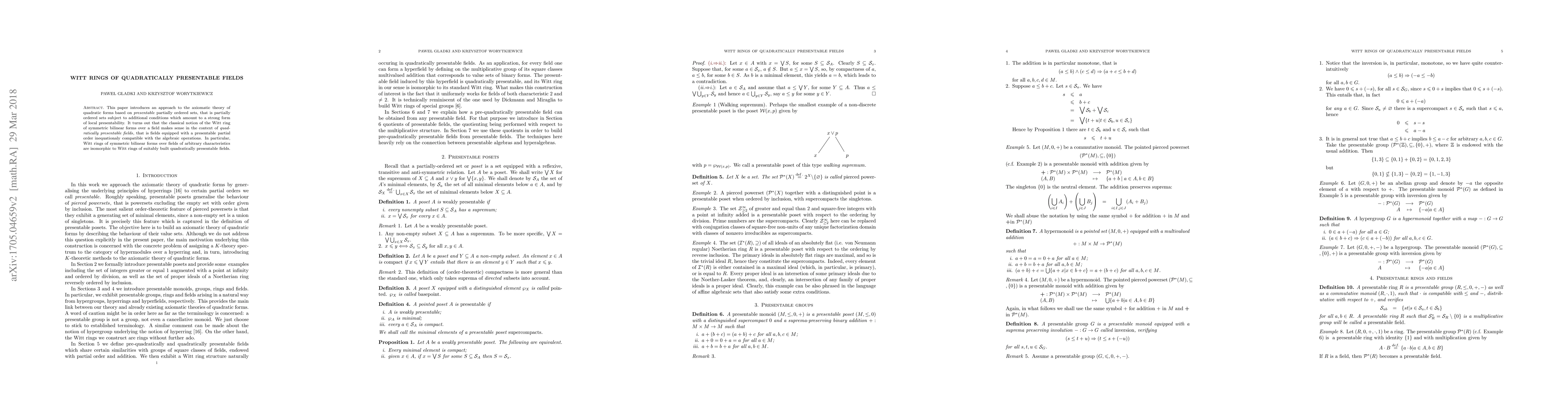 This paper introduces a novel approach to the axiomatic theory of quadratic forms. We work internally in a category of certain partially ordered sets, subject to additional conditions which amount to a strong form of local presentability. We call such partial orders presentable. It turns out that the classical notion of the Witt ring of symmetric bilinear forms over a field makes sense in the context of quadratically presentable fields, that is fields equipped with a presentable partial order inequationaly compatible with the algebraic operations. As an application, we show that Witt rings of symmetric bilinear forms over fields, of both characteristic 2 and not 2, are isomorphic to Witt rings of suitably built quadratically presentable fields, which therefore provide a uniform construction of Witt rings for all characteristics.