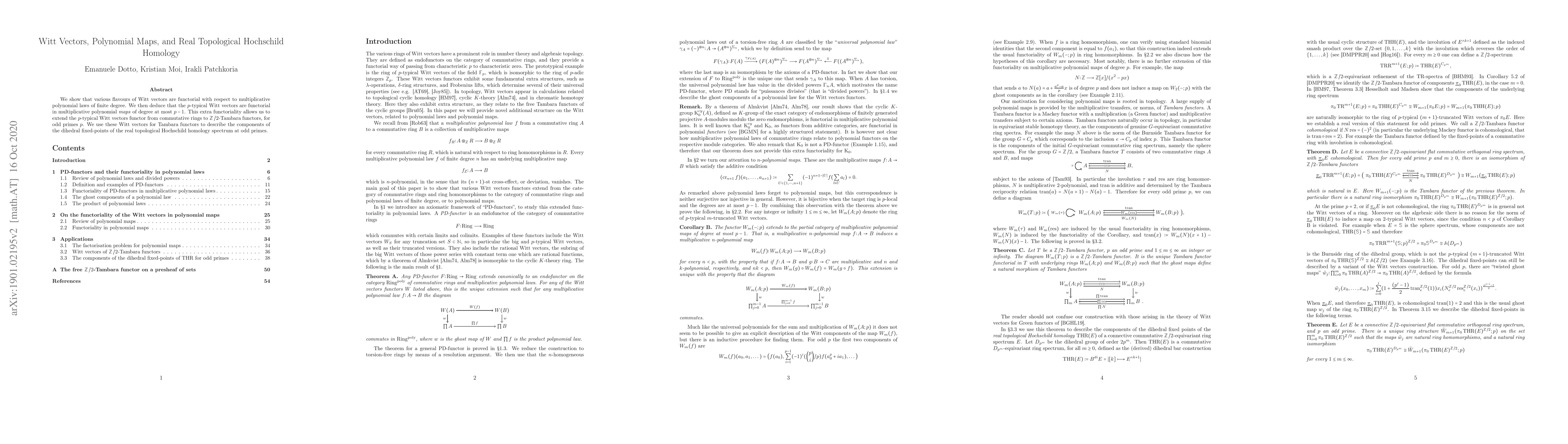 This paper demonstrates the functorial properties of Witt vectors with respect to multiplicative polynomial laws, extending their application to $\mathbb{Z}/2$-Tambara functors. It leverages $p$-typical Witt vectors to describe the dihedral fixed-points of real topological Hochschild homology at odd primes.