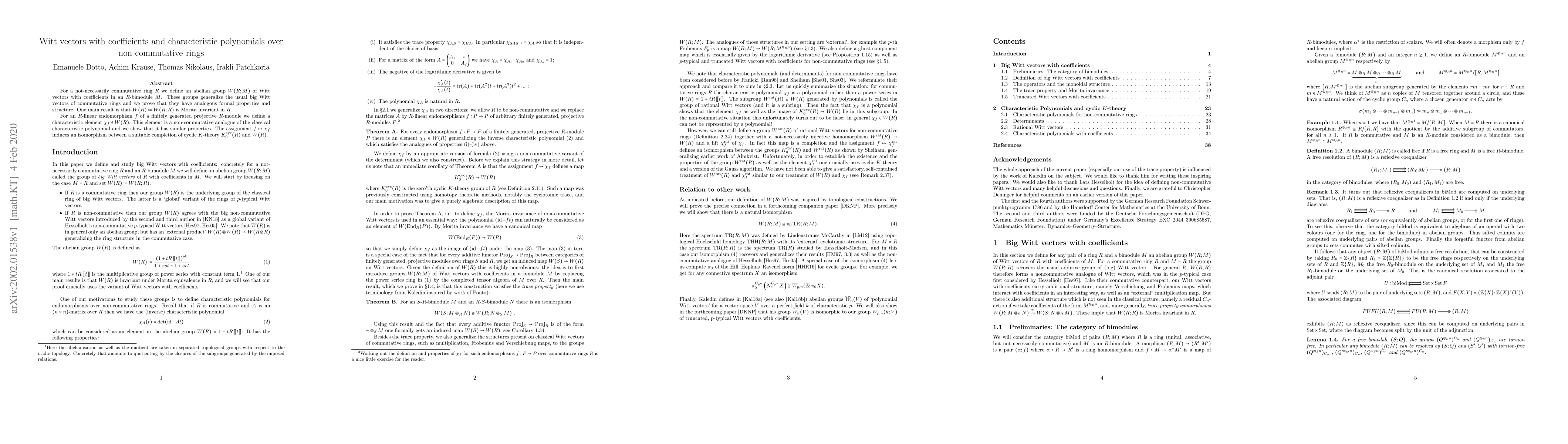 Summary: This paper introduces Witt vectors with coefficients in R-bimodules for non-commutative rings, proving they retain formal properties similar to those in commutative settings. It defines a non-commutative characteristic polynomial for R-linear endomorphisms of projective modules, establishing its properties and an isomorphism with cyclic K-theory.