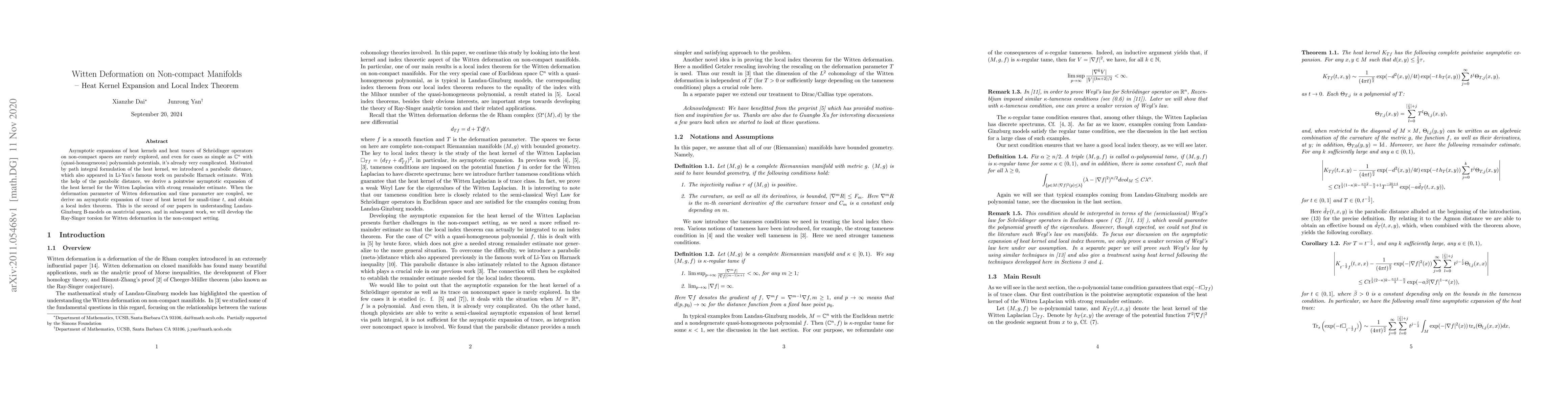The work extends previous research on heat kernel expansions by introducing a parabolic distance and deriving a local index theorem, providing new insights into Witten deformation on non-compact manifolds.