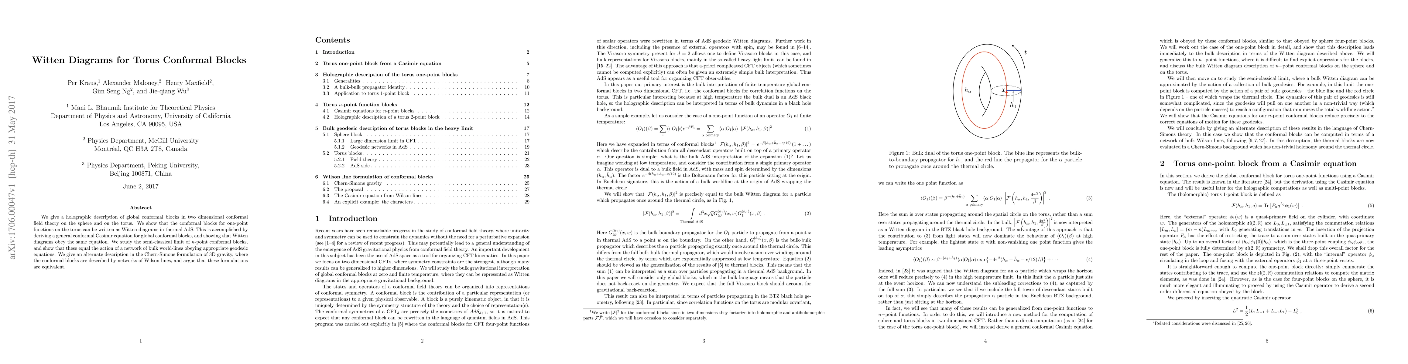 We give a holographic description of global conformal blocks in two dimensional conformal field theory on the sphere and on the torus. We show that the conformal blocks for one-point functions on the torus can be written as Witten diagrams in thermal AdS. This is accomplished by deriving a general conformal Casimir equation for global conformal blocks, and showing that Witten diagrams obey the same equation. We study the semi-classical limit of n-point conformal blocks, and show that these equal the action of a network of bulk world-lines obeying appropriate geodesic equations. We give an alternate description in the Chern-Simons formulation of 3D gravity, where the conformal blocks are described by networks of Wilson lines, and argue that these formulations are equivalent.