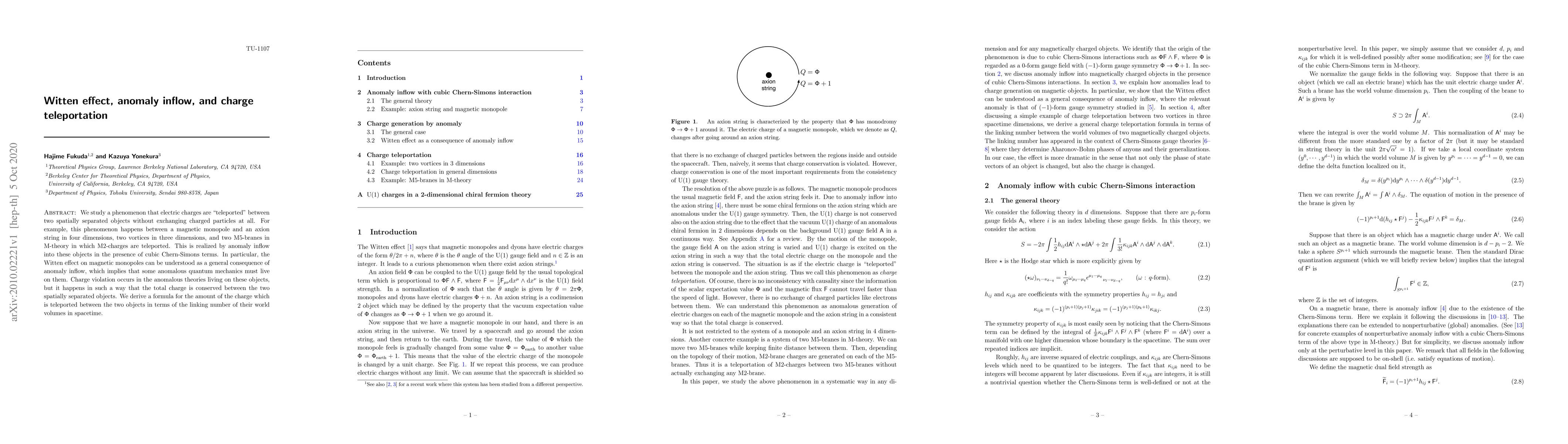 Researchers demonstrate how electric charges can be teleported between objects without physical exchange, using anomaly inflow in higher-dimensional spaces. The teleportation amount is calculated based on the linking number of the objects' world volumes.