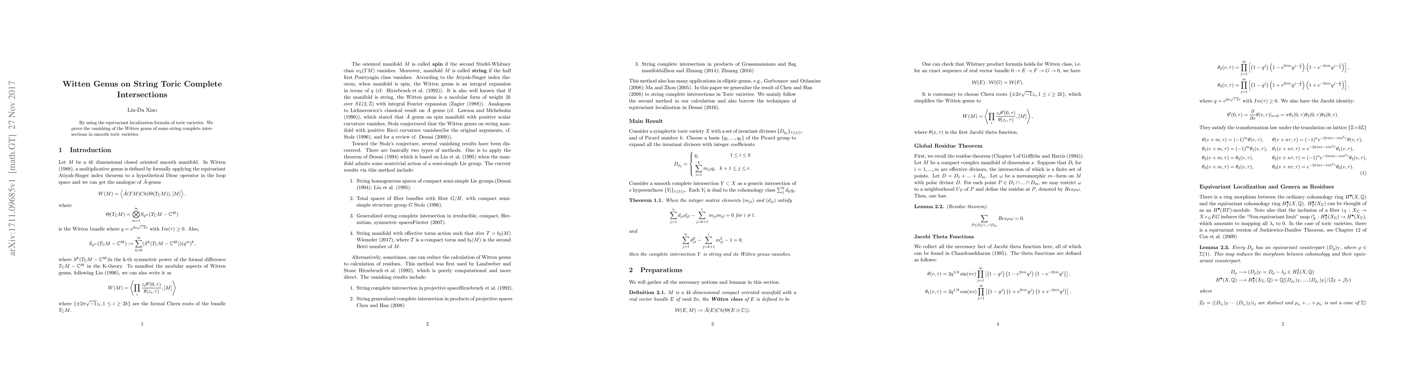 This paper utilizes the equivariant localization formula for toric varieties to demonstrate the vanishing of the Witten genus for certain string complete intersections within smooth toric varieties. The result highlights significant implications for the study of these geometric structures.