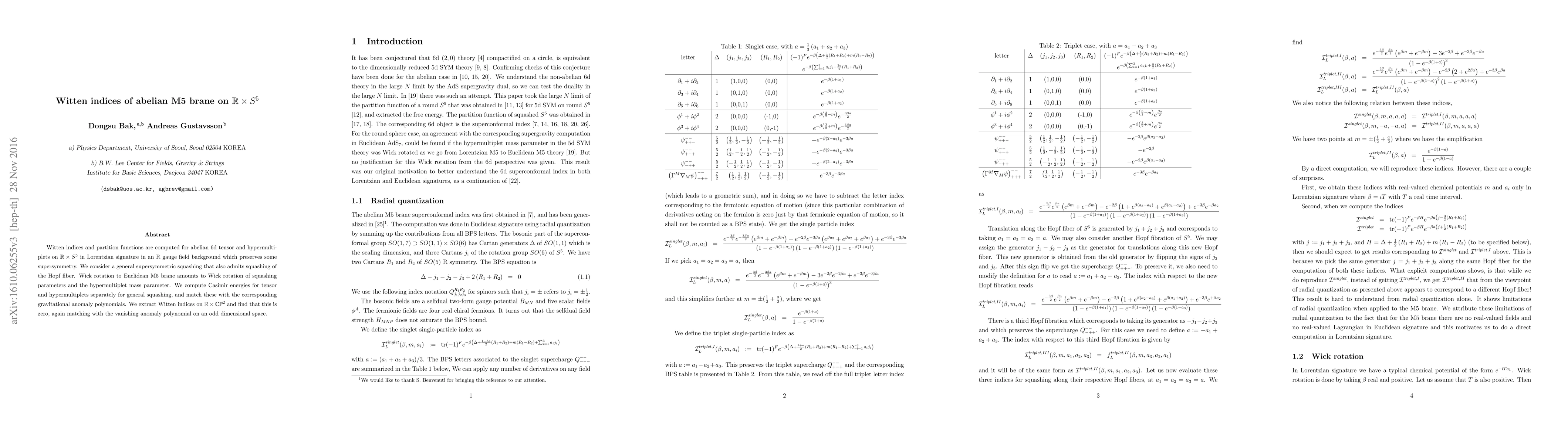 Witten indices and partition functions are computed for abelian 6d tensor and hypermultiplets on $\mathbb{R}\times S^5$ in Lorentzian signature in an R gauge field background which preserves some supersymmetry. We consider a generic supersymmetric squashing that also admits squashing of the Hopf fiber. Wick rotation to Euclidean M5 brane amounts to Wick rotation of squashing parameters and the hypermultiplet mass parameter. We compute Casimir energies for tensor and hypermultiplets separately for general squashing, and match these with the corresponding gravitational anomaly polynomials. We extract Witten indices on $\mathbb{R}\times \mathbb{CP}^2$ and find that this is zero, again matching with the vanishing anomaly polynomial on an odd dimensional space.