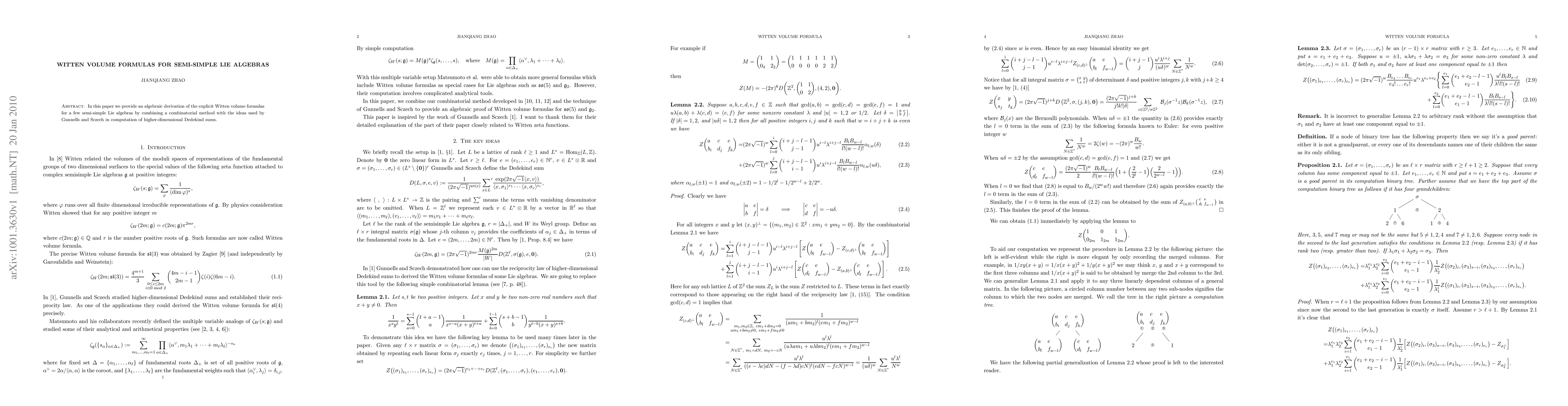 Researchers develop algebraic formulas to calculate Witten volume for specific Lie algebras, combining combinatorial methods with existing work on Dedekind sums.