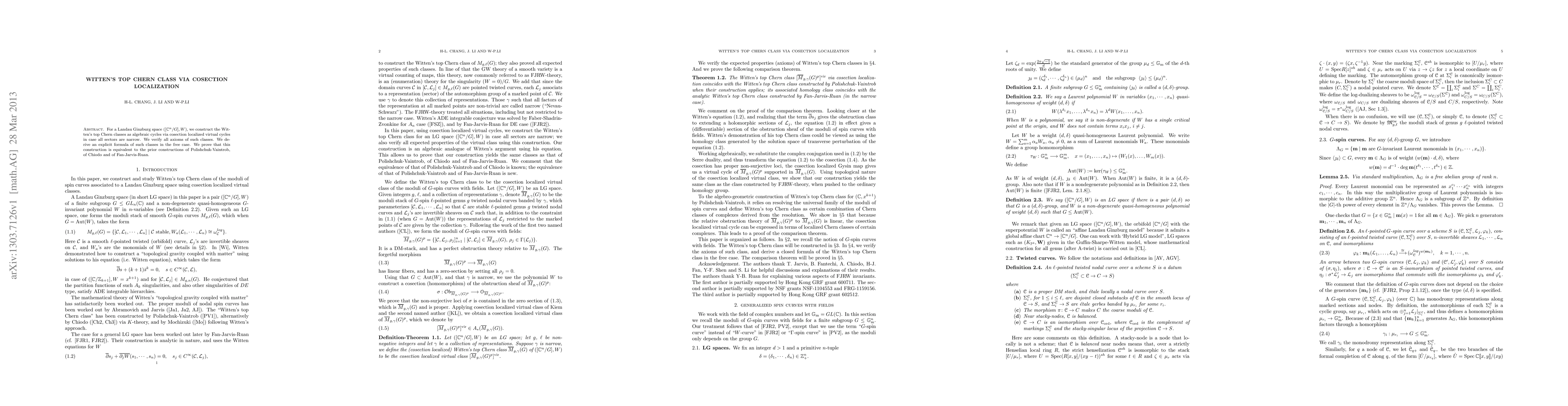 Summary: The paper constructs Witten's top Chern classes for Landau Ginzburg spaces using cosection localization, verifies their axioms, provides an explicit formula for the free case, and shows equivalence to prior constructions by Polishchuk-Vaintrob, Chiodo, and Fan-Jarvis-Ruan.