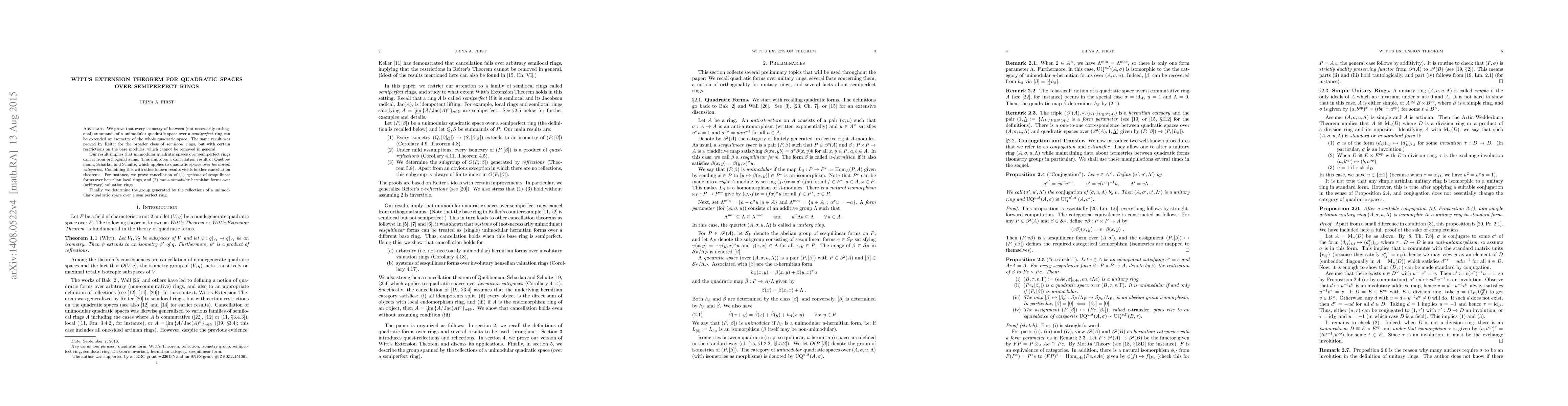 The paper proves Witt's Extension Theorem for quadratic spaces over semiperfect rings, showing isometries between summands can extend to the whole space, improving cancellation results over semilocal rings and yielding new cancellation theorems for sesquilinear forms and hermitian forms. Additionally, it determines the reflection group for unimodular quadratic spaces over semiperfect rings.