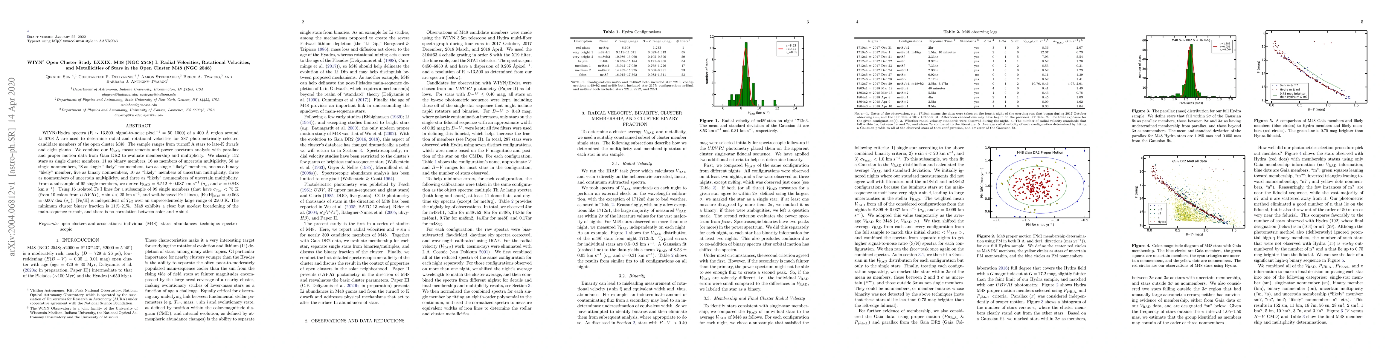 WIYN/Hydra spectra (R $\sim$ 13,500, signal-to-noise pixel$^{-1}$ = 50-1000) of a 400 $\unicode{x212B}$ region around Li 6708 $\unicode{x212B}$ are used to determine radial and rotational velocities for 287 photometrically selected candidate members of the open cluster M48. The sample ranges from turnoff A stars to late-K dwarfs and eight giants. We combine our $V_{\rm{RAD}}$ measurements and power spectrum analysis with parallax and proper motion data from Gaia DR2 to evaluate membership and multiplicity. We classify 152 stars as single cluster members, 11 as binary members, 16 as members of uncertain multiplicity, 56 as single nonmembers, 28 as single "likely" nonmembers, two as single "likely" members, one as a binary "likely" member, five as binary nonmembers, 10 as "likely" members of uncertain multiplicity, three as nonmembers of uncertain multiplicity, and three as "likely" nonmembers of uncertain multiplicity. From a subsample of 95 single members, we derive $V_{\rm{RAD}}$ = 8.512 $\pm$ 0.087 km s$^{-1}$ ($\sigma_{\mu}$, and $\sigma$ = 0.848 km s$^{-1}$). Using 16 isolated Fe I lines for a subsample of 99 single members (that have $\sigma_{T_{\rm{eff}}}$ $<$ 75 K (from 10 colors from $UBVRI$), $v$ sin $i$ $<$ 25 km s$^{-1}$, and well-behaved Fe I lines), [Fe/H]$_{\rm{M48}}$ = -0.063 $\pm$ 0.007 dex ($\sigma_{\mu}$). [Fe/H] is independent of $T_{\rm{eff}}$ over an unprecedentedly large range of 2500 K. The minimum cluster binary fraction is 11%-21%. M48 exhibits a clear but modest broadening of the main-sequence turnoff, and there is no correlation between color and $v$ sin $i$.