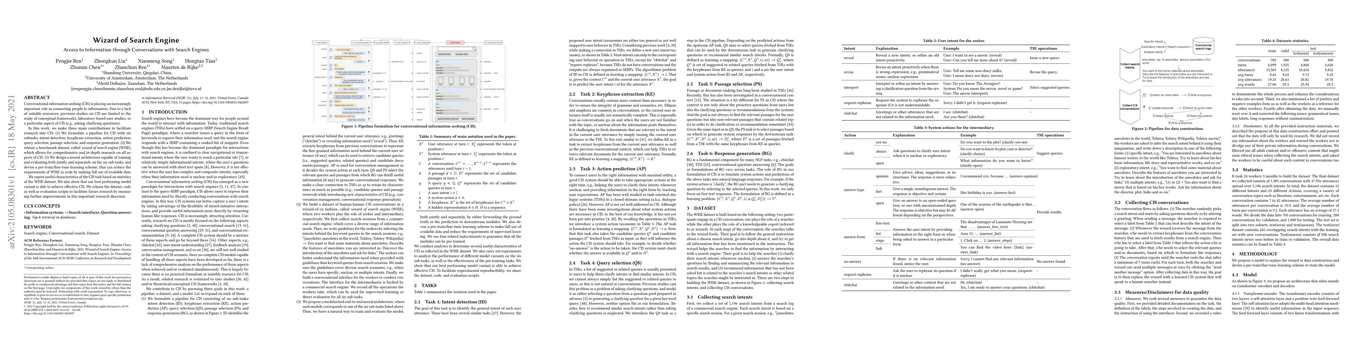 Conversational information seeking (CIS) is playing an increasingly important role in connecting people to information. Due to the lack of suitable resource, previous studies on CIS are limited to the study of theoretical/conceptual frameworks, laboratory-based user studies, or a particular aspect of CIS (e.g., asking clarifying questions). In this work, we make efforts to facilitate research on CIS from three aspects. (1) We formulate a pipeline for CIS with six sub-tasks: intent detection (ID), keyphrase extraction (KE), action prediction (AP), query selection (QS), passage selection (PS), and response generation (RG). (2) We release a benchmark dataset, called wizard of search engine (WISE), which allows for comprehensive and in-depth research on all aspects of CIS. (3) We design a neural architecture capable of training and evaluating both jointly and separately on the six sub-tasks, and devise a pre-train/fine-tune learning scheme, that can reduce the requirements of WISE in scale by making full use of available data. We report some useful characteristics of CIS based on statistics of WISE. We also show that our best performing model variant isable to achieve effective CIS as indicated by several metrics. We release the dataset, the code, as well as the evaluation scripts to facilitate future research by measuring further improvements in this important research direction.