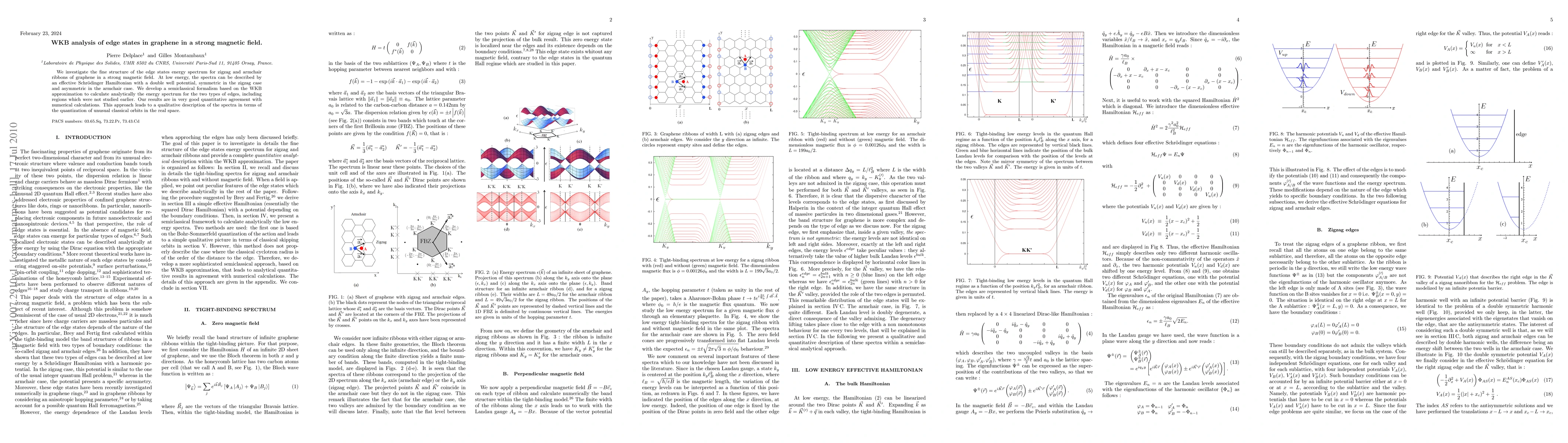 We investigate the fine structure of the edge states energy spectrum for zigzag and armchair ribbons of graphene in a strong magnetic field. At low energy, the spectra can be described by an effective Schrodinger Hamiltonian with a double well potential, symmetric in the zigzag case and asymmetric in the armchair case. We develop a semiclassical formalism based on the WKB approximation to calculate analytically the energy spectrum for the two types of edges, including regions which were not studied earlier. Our results are in very good quantitative agreement with numerical calculations. This approach leads to a qualitative description of the spectra in terms of the quantization of unusual classical orbits in the real space.