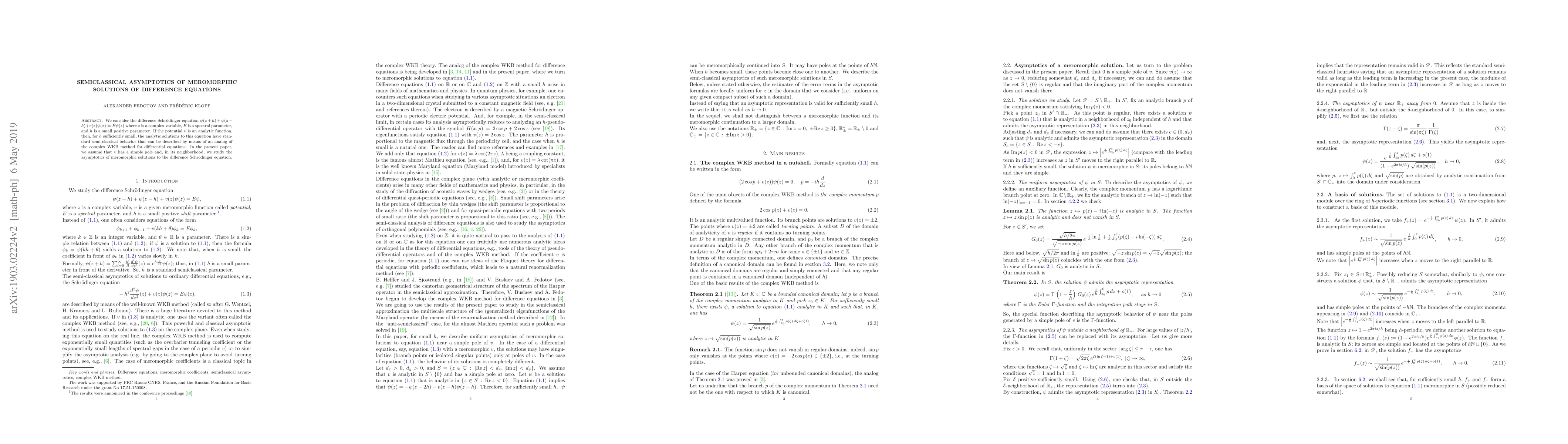 This paper investigates the asymptotic behavior of meromorphic solutions to the difference Schrödinger equation with a potential having a simple pole. It employs the complex WKB method to analyze the semi-classical behavior of analytic solutions for small parameters.