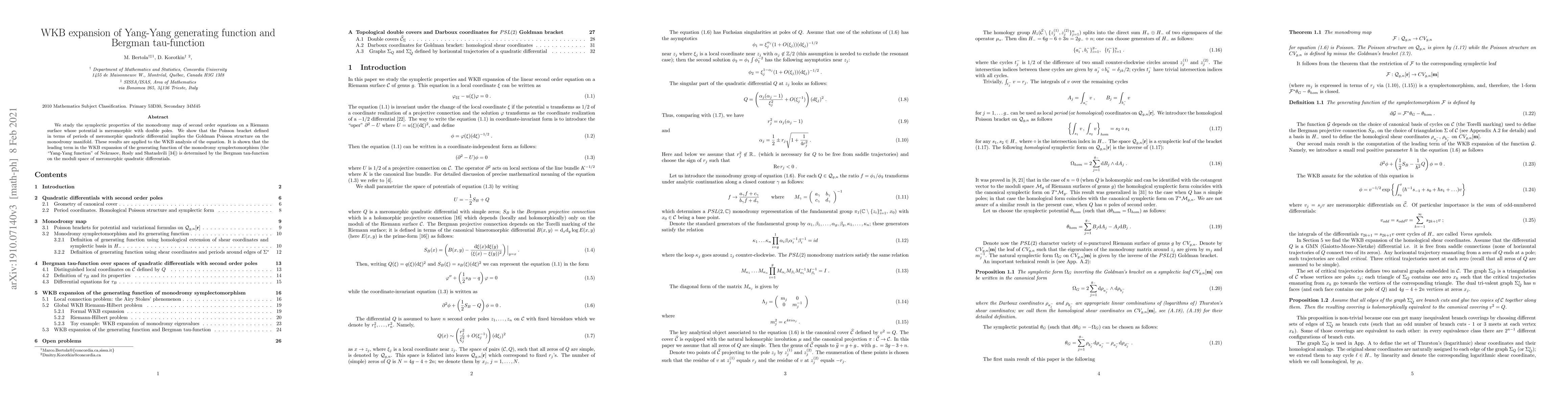This paper investigates the symplectic properties of the monodromy map for second-order equations on Riemann surfaces with meromorphic potentials and applies WKB analysis to determine the leading term in the WKB expansion of the Yang-Yang generating function, which is shown to be governed by the Bergman tau-function.