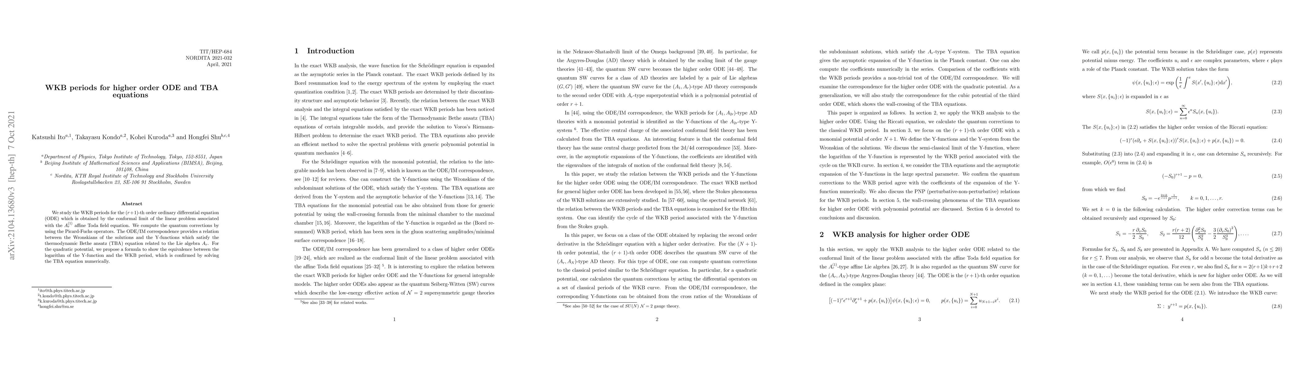 This paper investigates WKB periods for higher-order ODEs derived from the conformal limit of the $A_r^{(1)}$ affine Toda field equation, employing Picard-Fuchs operators for quantum corrections. The study establishes a connection between the Wronskians of ODE solutions and Y-functions from the TBA equation, proposing a formula for the quadratic potential to demonstrate the equivalence between the Y-function's logarithm and the WKB period, validated through numerical TBA equation solutions.