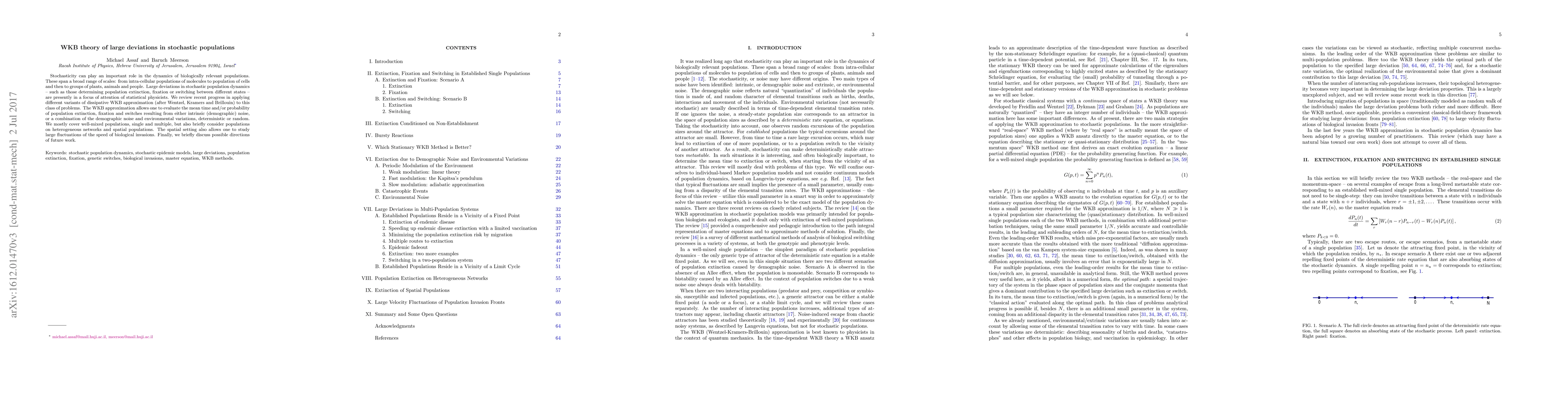 Stochasticity can play an important role in the dynamics of biologically relevant populations. These span a broad range of scales: from intra-cellular populations of molecules to population of cells and then to groups of plants, animals and people. Large deviations in stochastic population dynamics - such as those determining population extinction, fixation or switching between different states - are presently in a focus of attention of statistical physicists. We review recent progress in applying different variants of dissipative WKB approximation (after Wentzel, Kramers and Brillouin) to this class of problems. The WKB approximation allows one to evaluate the mean time and/or probability of population extinction, fixation and switches resulting from either intrinsic (demographic) noise, or a combination of the demographic noise and environmental variations, deterministic or random. We mostly cover well-mixed populations, single and multiple, but also briefly consider populations on heterogeneous networks and spatial populations. The spatial setting also allows one to study large fluctuations of the speed of biological invasions. Finally, we briefly discuss possible directions of future work.