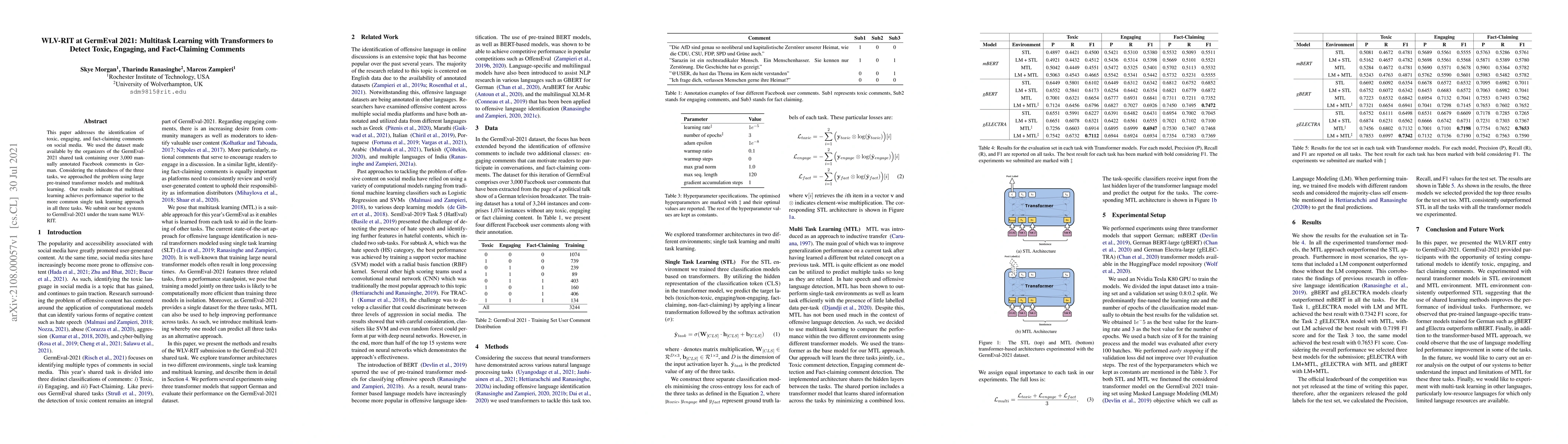 This paper addresses the identification of toxic, engaging, and fact-claiming comments on social media. We used the dataset made available by the organizers of the GermEval-2021 shared task containing over 3,000 manually annotated Facebook comments in German. Considering the relatedness of the three tasks, we approached the problem using large pre-trained transformer models and multitask learning. Our results indicate that multitask learning achieves performance superior to the more common single task learning approach in all three tasks. We submit our best systems to GermEval-2021 under the team name WLV-RIT.