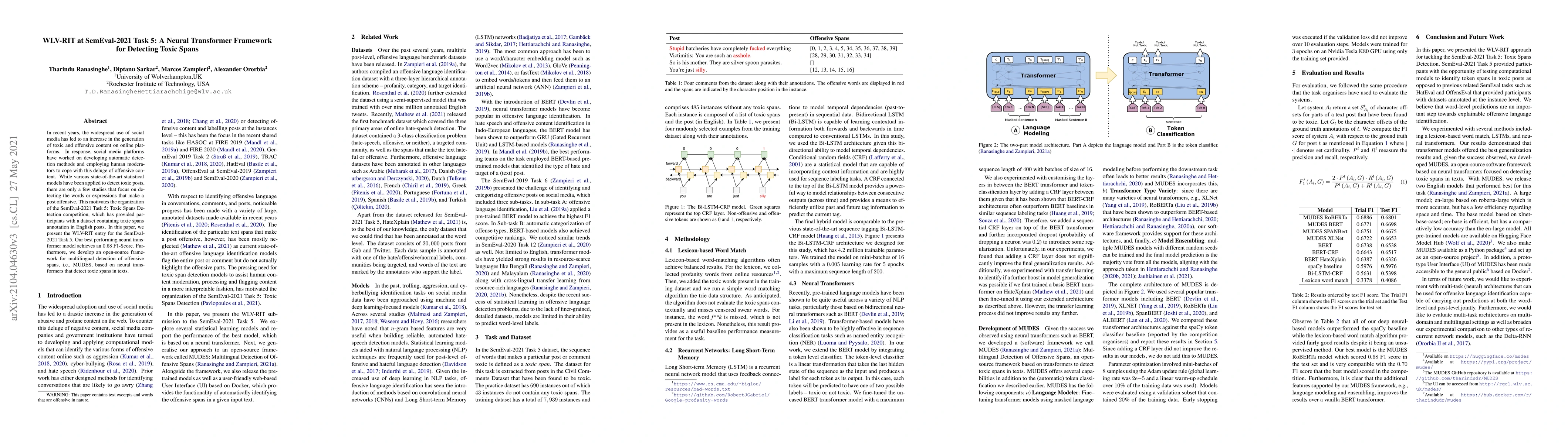 The WLV-RIT team developed a neural transformer framework to detect toxic spans in social media posts, achieving a $0.68$ F1-Score in SemEval-2021 Task 5. They also introduced MUDES, an open-source framework for multilingual toxic span detection.