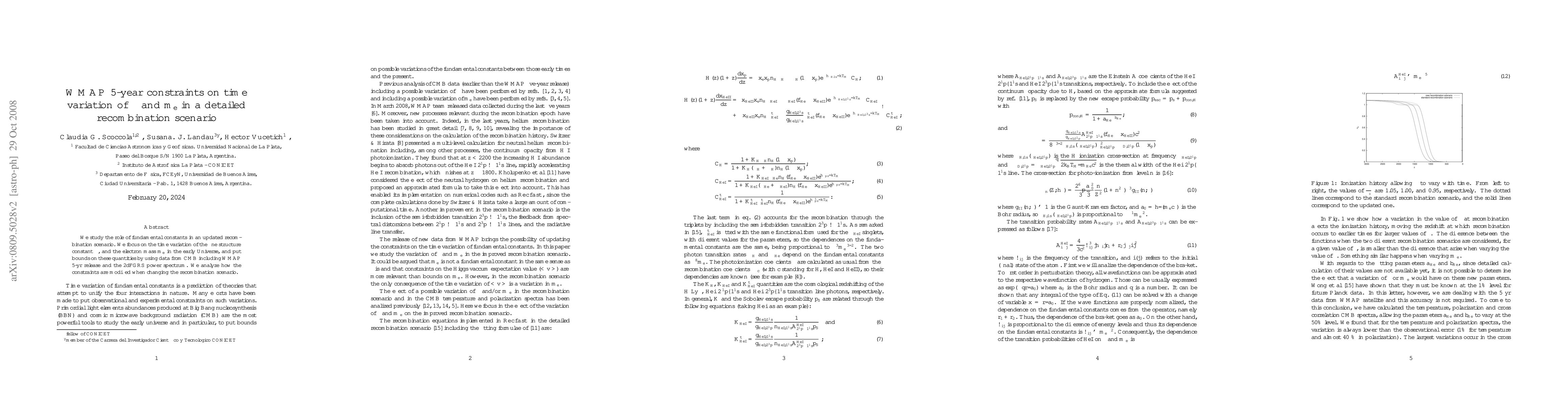 This paper examines the time variation of the fine structure constant and electron mass in the early Universe using WMAP 5-year data and 2dFGRS, placing constraints on these quantities and analyzing how recombination scenarios affect the results.