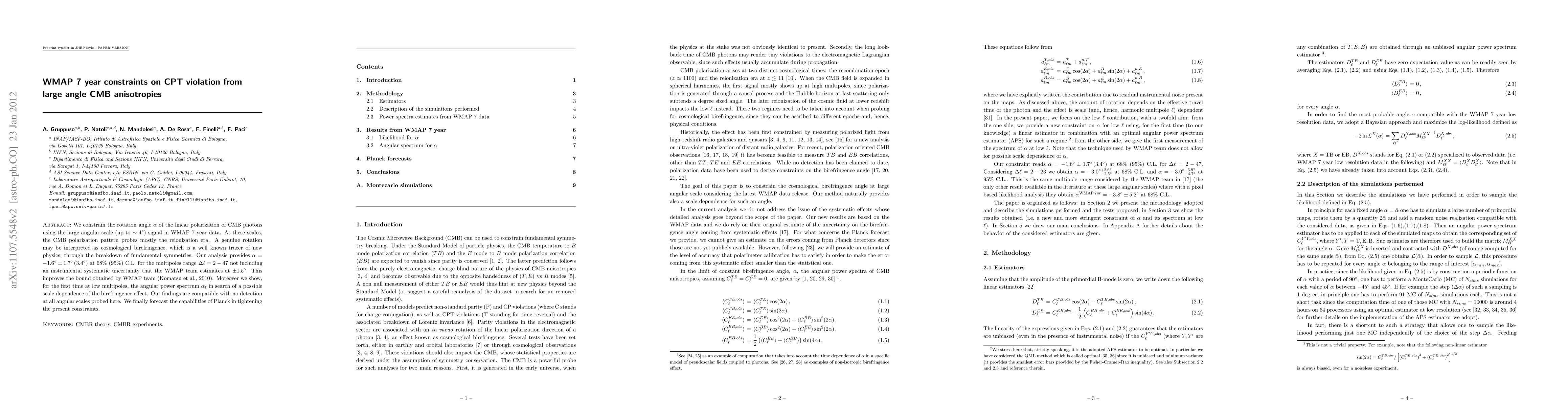 The WMAP 7 year data analysis constrains the rotation angle $\alpha$ of CMB photon polarization to $-1.6^{\circ} \pm 1.7^{\circ}$ (3.4^{\circ}), indicating no significant detection of cosmological birefringence, and forecasts improved constraints from the Planck mission.