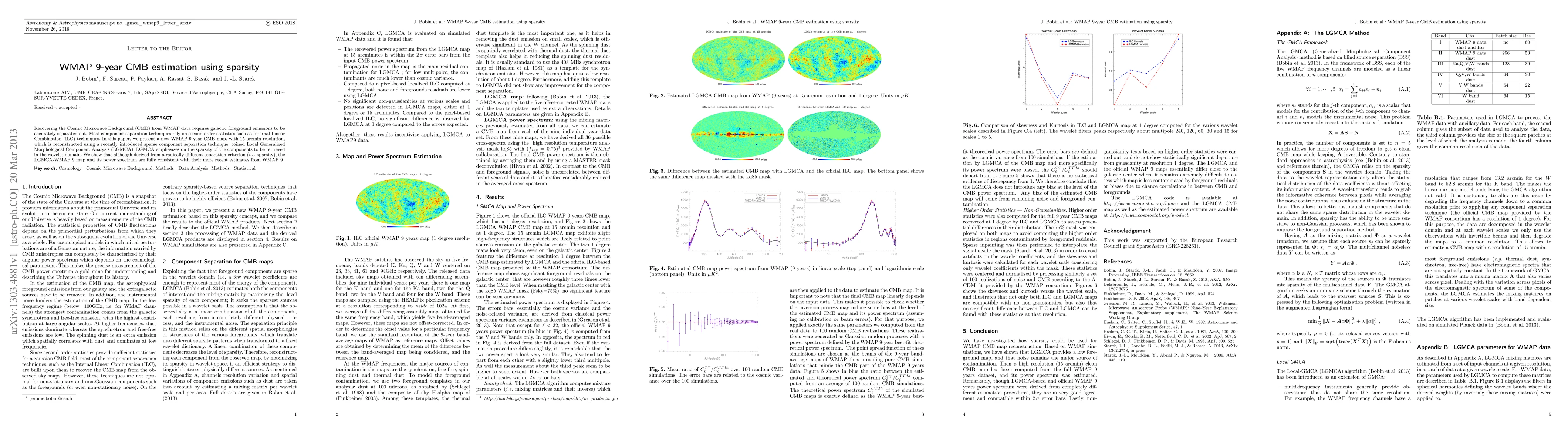 This paper introduces a new WMAP 9-year Cosmic Microwave Background (CMB) map using the Local Generalized Morphological Component Analysis (LGMCA) technique, which leverages sparsity in the wavelet domain for component separation. The resulting map, with 15 arcmin resolution, is consistent with more recent CMB estimates from WMAP 9.
