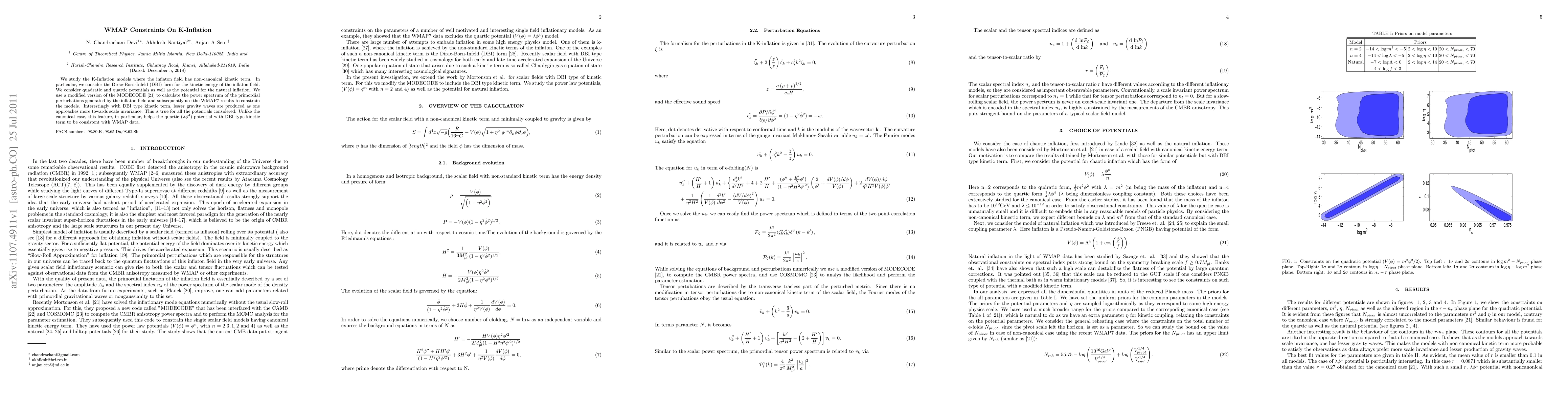 We study the K-Inflation models where the inflaton field has non-canonical kinetic term. In particular, we consider the Dirac-Born-Infeld (DBI) form for the kinetic energy of the inflaton field. We consider quadratic and quartic potentials as well as the potential for the natural inflation. We use a modified version of the MODECODE (proposed by Mortonson et al.) to calculate the power spectrum of the primordial perturbations generated by the inflaton field and subsequently use the WMAP7 results to constrain the models. Interestingly with DBI type kinetic term, lesser gravity waves are produced as one approaches more towards scale invariance. This is true for all the potentials considered. Unlike the canonical case, this feature, in particular, helps the quartic ($\lambda\phi^4$) potential with DBI type kinetic term to be consistent with WMAP data.