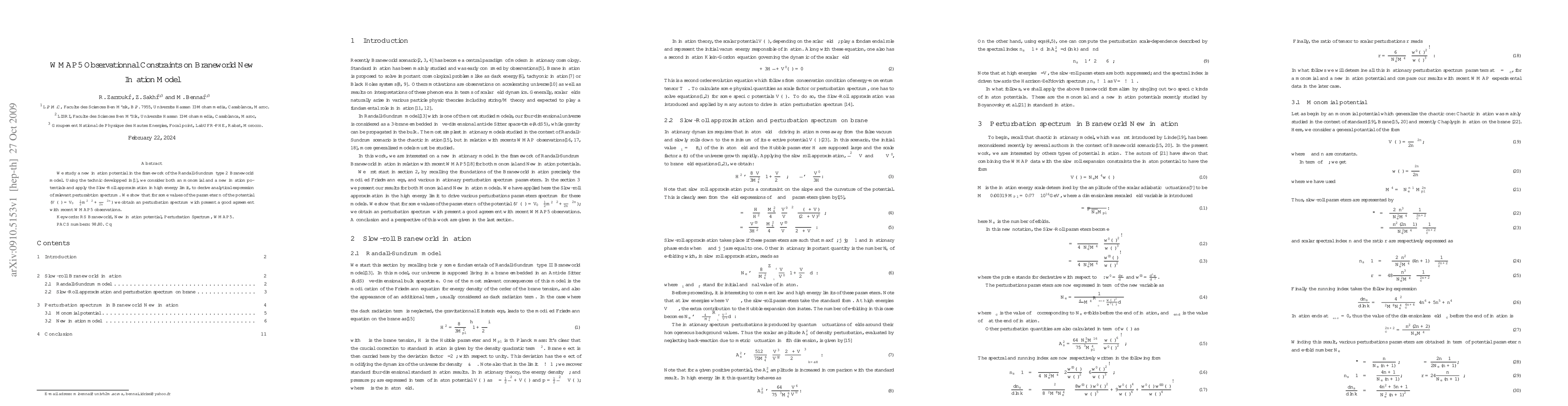 This paper explores a new inflation potential within the Randall-Sundrum type 2 Braneworld model, deriving analytical expressions for relevant perturbation spectra using the Slow-Roll approximation. The study finds that certain parameter values yield a perturbation spectrum that aligns well with recent WMAP5 observational data.