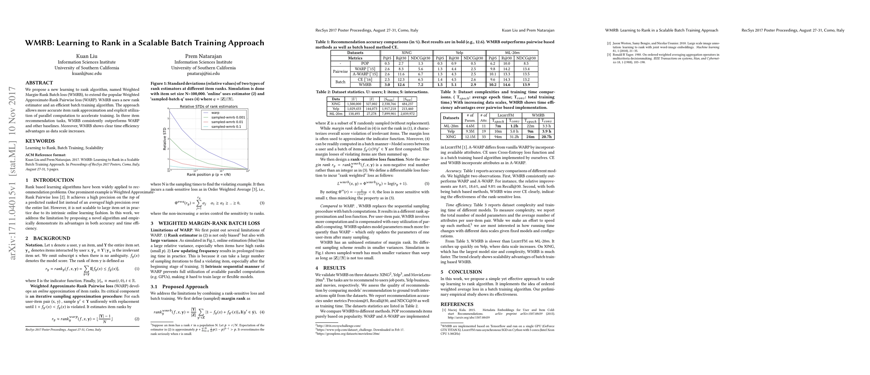 A new learning to rank algorithm called WMRB outperforms existing methods in item recommendation tasks, offering improved accuracy and time efficiency as data scale increases.