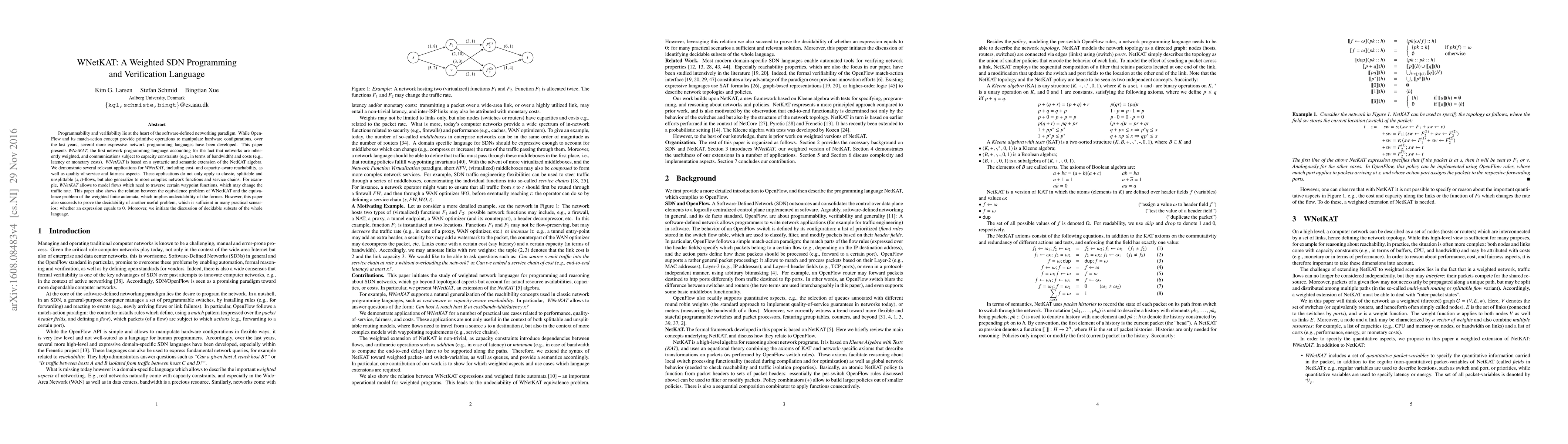 Programmability and verifiability lie at the heart of the software-defined networking paradigm. While OpenFlow and its match-action concept provide primitive operations to manipulate hardware configurations, over the last years, several more expressive network programming languages have been developed. This paper presents WNetKAT, the first network programming language accounting for the fact that networks are inherently weighted, and communications subject to capacity constraints (e.g., in terms of bandwidth) and costs (e.g., latency or monetary costs). WNetKAT is based on a syntactic and semantic extension of the NetKAT algebra. We demonstrate several relevant applications for WNetKAT, including cost- and capacity-aware reachability, as well as quality-of-service and fairness aspects. These applications do not only apply to classic, splittable and unsplittable (s; t)-flows, but also generalize to more complex network functions and service chains. For example, WNetKAT allows to model flows which need to traverse certain waypoint functions, which may change the traffic rate. This paper also shows the relation between the equivalence problem of WNetKAT and the equivalence problem of the weighted finite automata, which implies undecidability of the former. However, this paper also succeeds to prove the decidability of another useful problem, which is sufficient in many practical scnearios: whether an expression equals to 0. Moreover, we initiate the discussion of decidable subsets of the whole language.