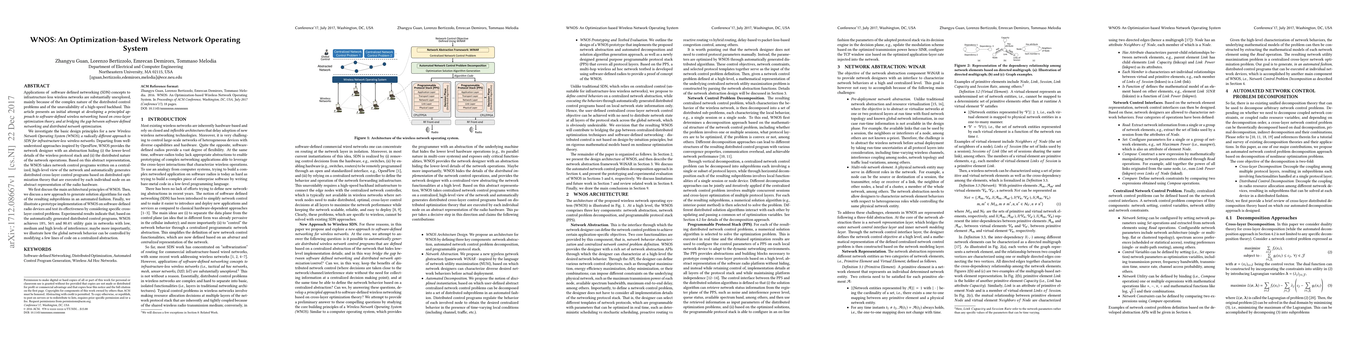 This paper introduces WNOS, an optimization-based Wireless Network Operating System for infrastructure-less wireless networks, which abstracts lower-level protocol details and network distribution. It demonstrates significant utility gains across varying interference levels and showcases centralized control over network behavior through simple code modifications.