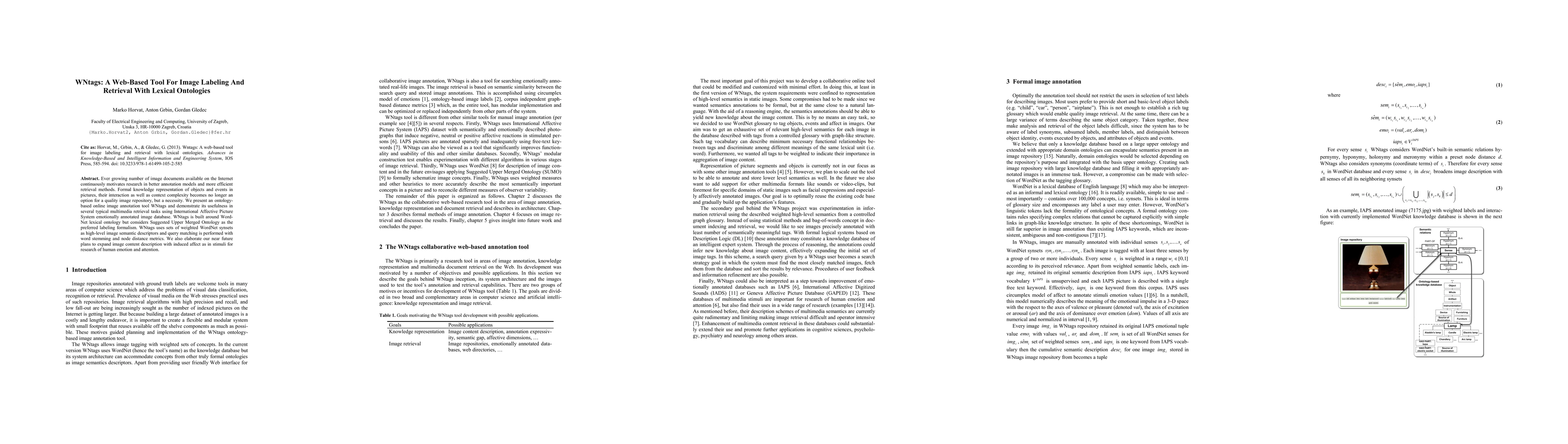 WNtags is an online image annotation tool based on the WordNet lexical ontology and SUM ontology for efficient image retrieval. It employs weighted WordNet synsets for semantic descriptors and uses word stemming and node distance metrics for query matching, demonstrated through tasks using the International Affective Picture System.