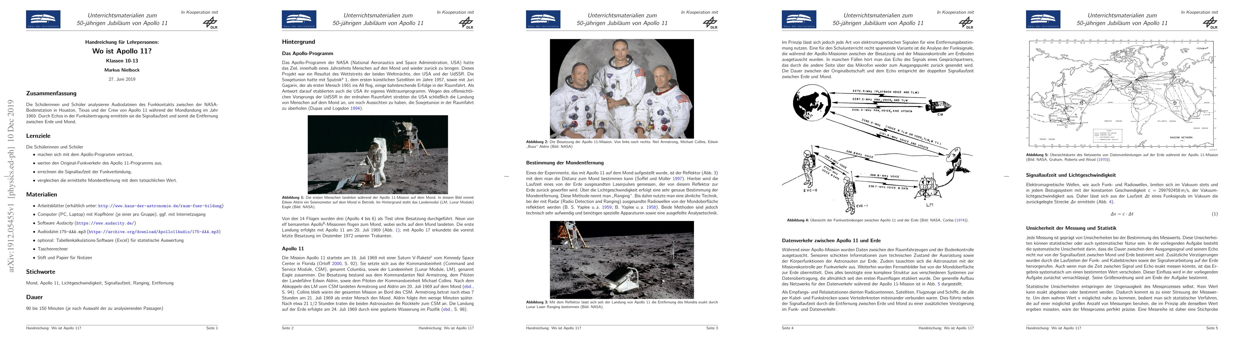 This activity was created within the framework of the "Space for Education" project, which ams at experiencing physical principles on the basis of topics related to space travel. The students analyze audio files of the radio contact between the NASA ground station in Houston, Texas and the crew of Apollo 11 during the moon landing in 1969. Through echoes in the radio transmission they determine the signal propagation time and thus the distance between earth and moon. Additional materials at: https://www.haus-der-astronomie.de/raum-fuer-bildung ----- Diese Aktivit\"at wurde im Rahmen des Projekts "Raum f\"ur Bildung" erstellt, welches physikalische Prinzipien anhand der Raumfahrt erlebbar macht. Die Sch\"ulerinnen und Sch\"uler analysieren Audiodateien des Funkkontakts zwischen der NASA- Bodenstation in Houston, Texas und der Crew von Apollo 11 wahrend der Mondlandung im Jahr 1969. Durch Echos in der Funk\"ubertragung ermitteln sie die Signallaufzeit und somit die Entfernung zwischen Erde und Mond. Weitere Materialien unter: https://www.haus-der-astronomie.de/raum-fuer-bildung