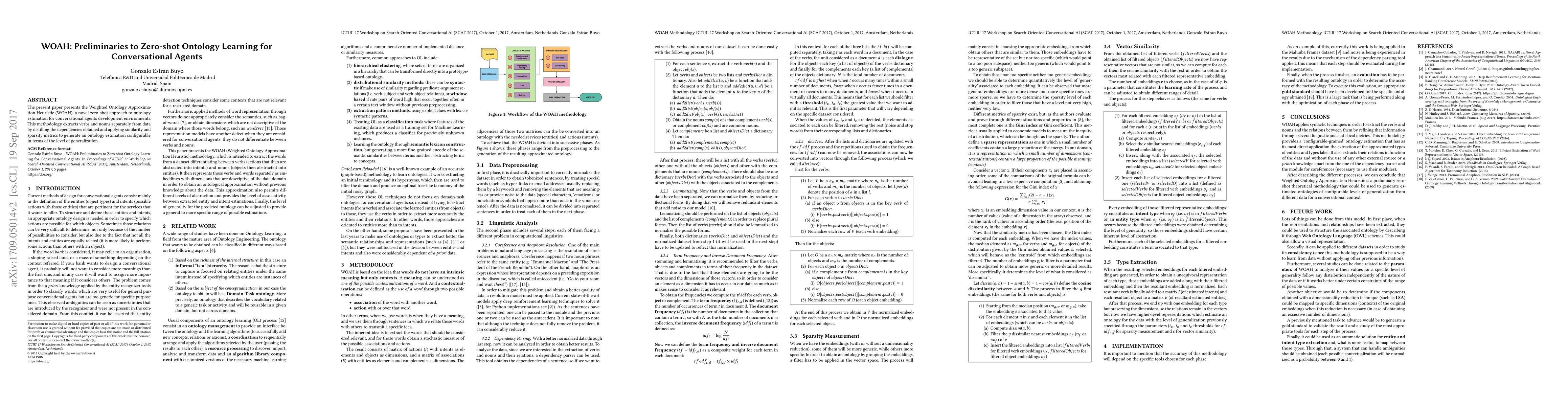 The paper introduces WOAH, a novel zero-shot ontology learning method for conversational agents that extracts verbs and nouns from data to generate an ontology estimation based on similarity and sparsity metrics, adaptable to varying levels of generalization.