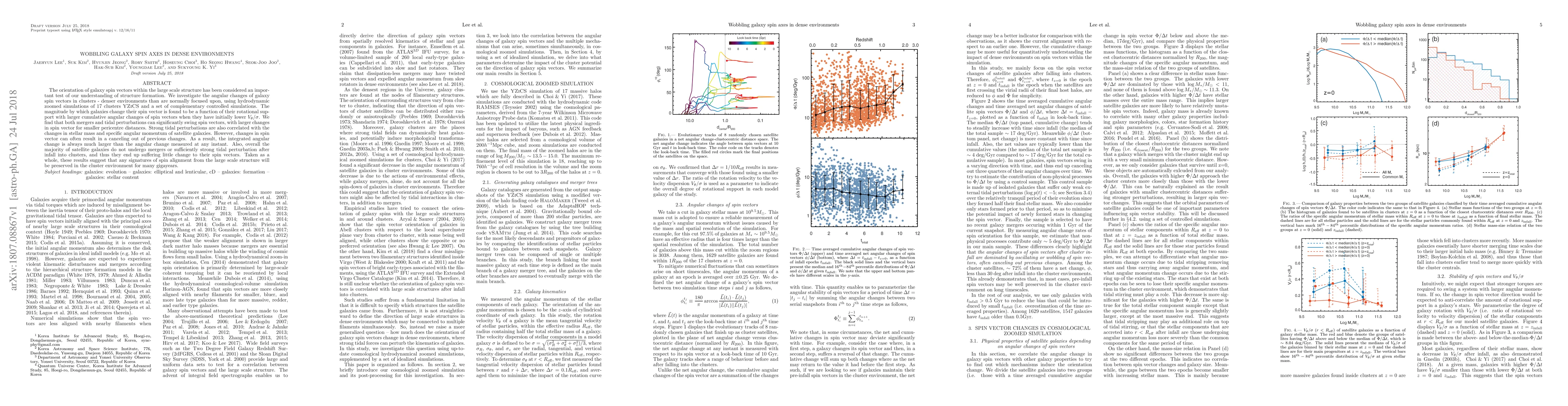Galaxy spin vectors change significantly in dense cluster environments due to mergers and tidal perturbations, but these changes often cancel each other out over long periods of time.