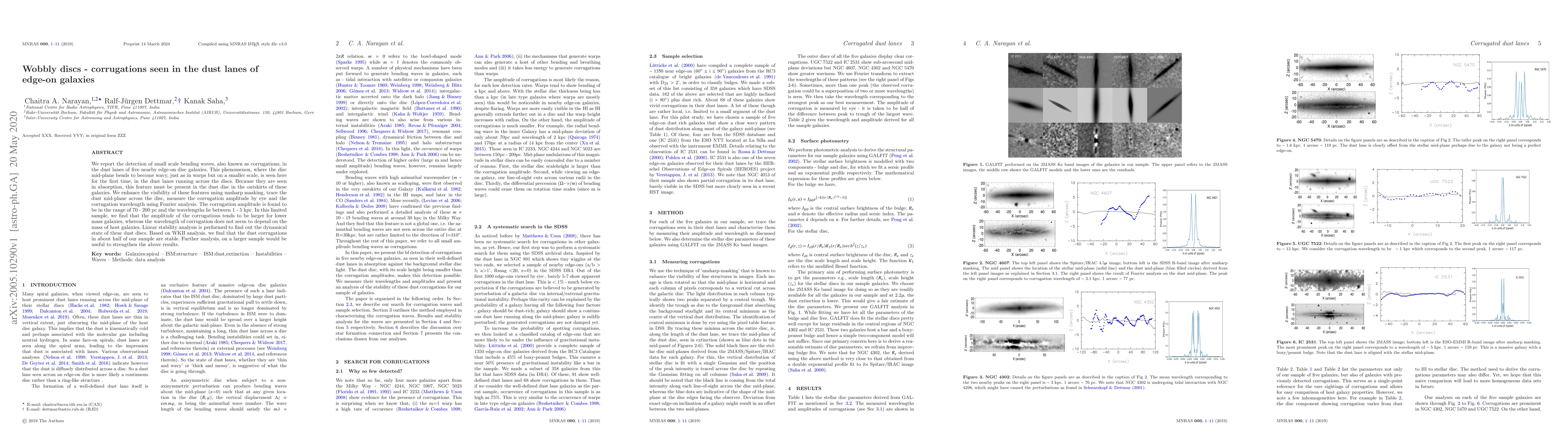 We report the detection of small scale bending waves, also known as corrugations, in the dust lanes of five nearby edge-on disc galaxies. This phenomenon, where the disc mid-plane bends to become wavy, just as in warps but on a smaller scale, is seen here for the first time, in the dust lanes running across the discs. Because they are seen in absorption, this feature must be present in the dust disc in the outskirts of these galaxies. We enhance the visibility of these features using unsharp masking, trace the dust mid-plane across the disc, measure the corrugation amplitude by eye and the corrugation wavelength using Fourier analysis. The corrugation amplitude is found to be in the range of 70 - 200 pc and the wavelengths lie between 1 - 5 kpc. In this limited sample, we find that the amplitude of the corrugations tends to be larger for lower mass galaxies, whereas the wavelength of corrugation does not seem to depend on the mass of host galaxies. Linear stability analysis is performed to find out the dynamical state of these dust discs. Based on WKB analysis, we find that the dust corrugations in about half of our sample are stable. Further analysis, on a larger sample would be useful to strengthen the above results.