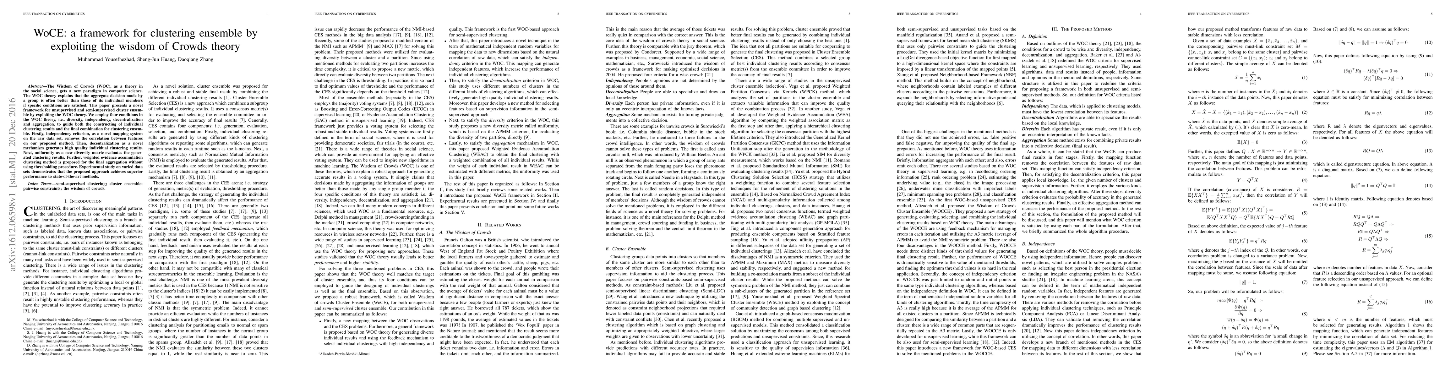 This paper proposes a framework for clustering ensemble using the Wisdom of Crowds theory to improve cluster quality and performance. It achieves superior results compared to state-of-the-art methods on varied datasets.