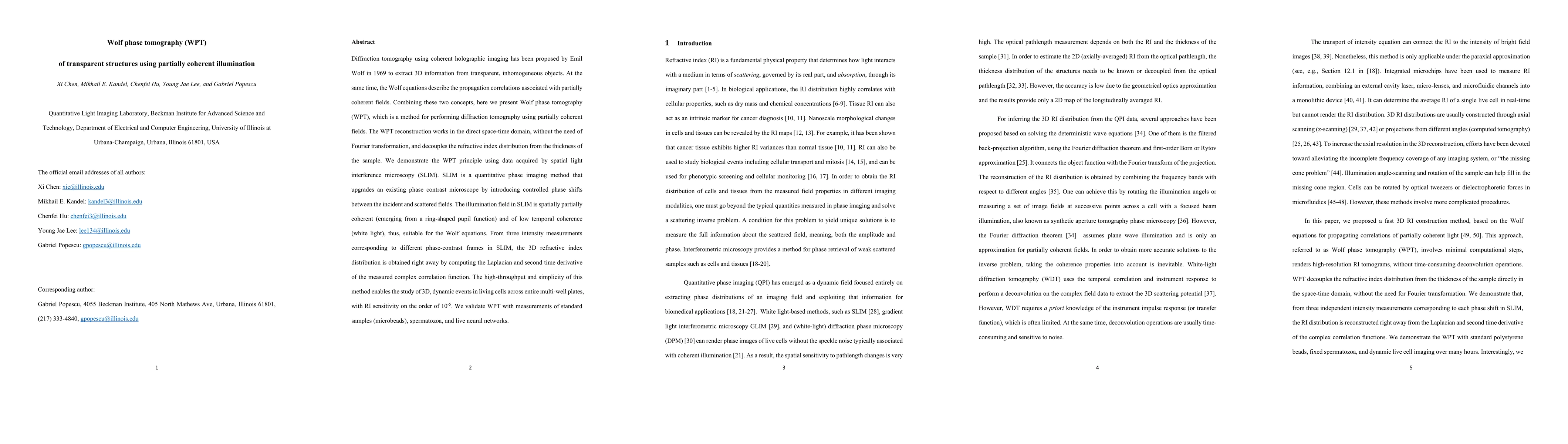 Wolf phase tomography (WPT) combines diffraction tomography with partially coherent light to extract 3D refractive index information from transparent samples directly in the space-time domain. Demonstrated using spatial light interference microscopy, WPT achieves high-throughput 3D imaging of dynamic events in living cells with RI sensitivity of 10^-5.