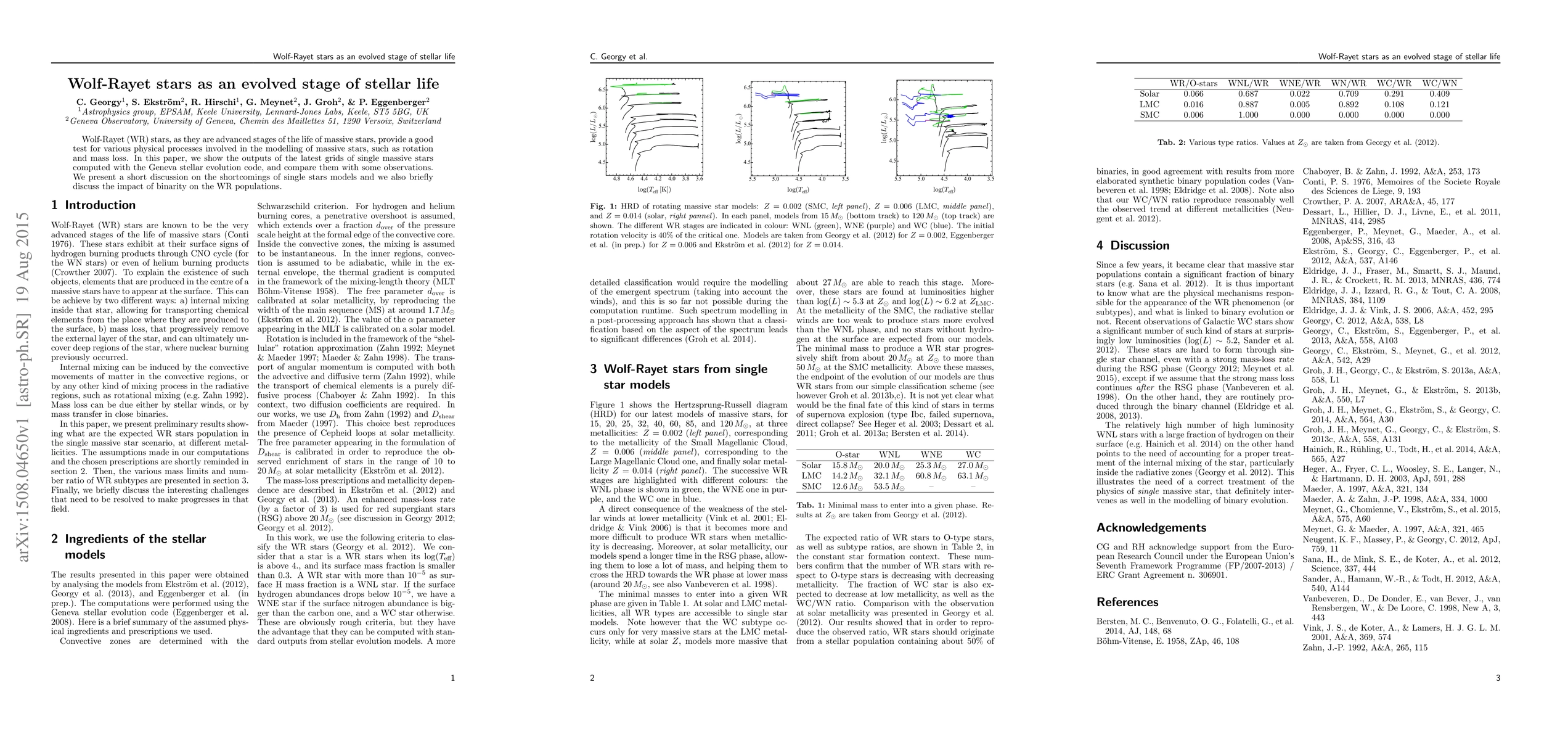 Wolf-Rayet (WR) stars, as they are advanced stages of the life of massive stars, provide a good test for various physical processes involved in the modelling of massive stars, such as rotation and mass loss. In this paper, we show the outputs of the latest grids of single massive stars computed with the Geneva stellar evolution code, and compare them with some observations. We present a short discussion on the shortcomings of single stars models and we also briefly discuss the impact of binarity on the WR populations.