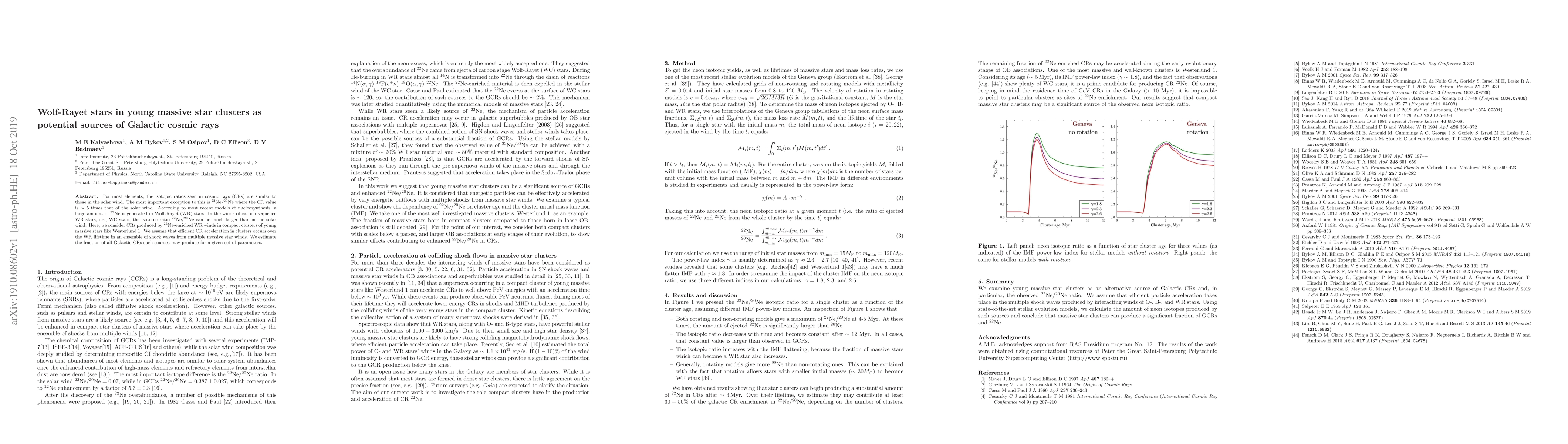 This paper explores the potential of Wolf-Rayet stars in young massive star clusters to generate Galactic cosmic rays, particularly focusing on the isotopic ratio of $^{22}$Ne/$^{20}$Ne, which is significantly higher in cosmic rays than in the solar wind. It estimates the contribution of such stars to the overall Galactic cosmic ray flux.