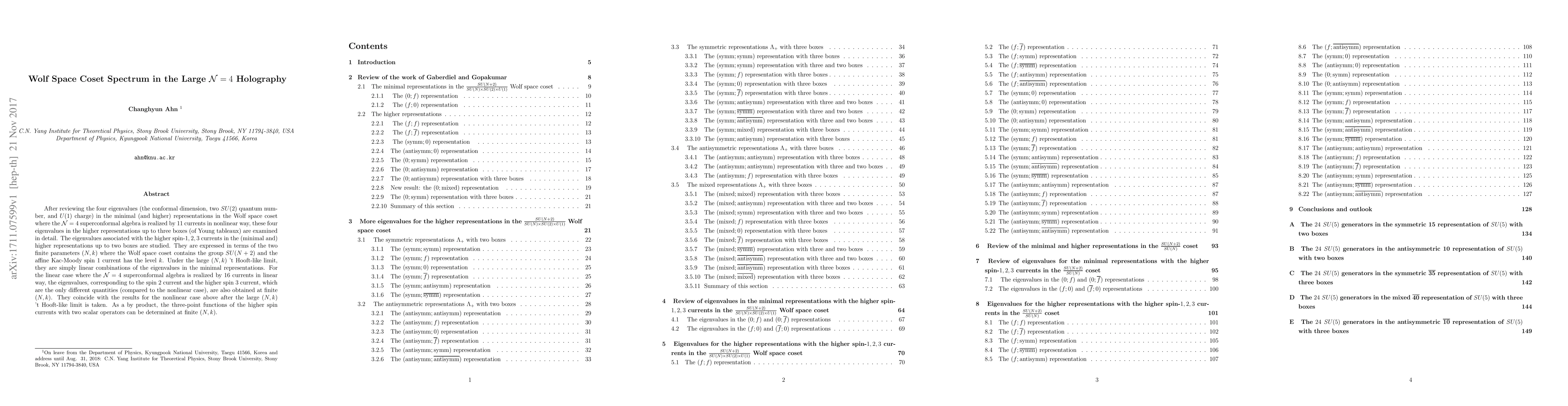 After reviewing the four eigenvalues (the conformal dimension, two $SU(2)$ quantum number, and $U(1)$ charge) in the minimal (and higher) representations in the Wolf space coset where the ${\cal N}=4$ superconformal algebra is realized by $11$ currents in nonlinear way, these four eigenvalues in the higher representations up to three boxes (of Young tableaux) are examined in detail. The eigenvalues associated with the higher spin-$1,2,3$ currents in the (minimal and) higher representations up to two boxes are studied. They are expressed in terms of the two finite parameters $(N, k)$ where the Wolf space coset contains the group $SU(N+2)$ and the affine Kac-Moody spin $1$ current has the level $k$. Under the large $(N,k)$ 't Hooft-like limit, they are simply linear combinations of the eigenvalues in the minimal representations. For the linear case where the ${\cal N}=4$ superconformal algebra is realized by $16$ currents in linear way, the eigenvalues, corresponding to the spin $2$ current and the higher spin $3$ current, which are the only different quantities (compared to the nonlinear case), are also obtained at finite $(N,k)$. They coincide with the results for the nonlinear case above after the large $(N,k)$ 't Hooft-like limit is taken. As a by product, the three-point functions of the higher spin currents with two scalar operators can be determined at finite $(N,k)$.