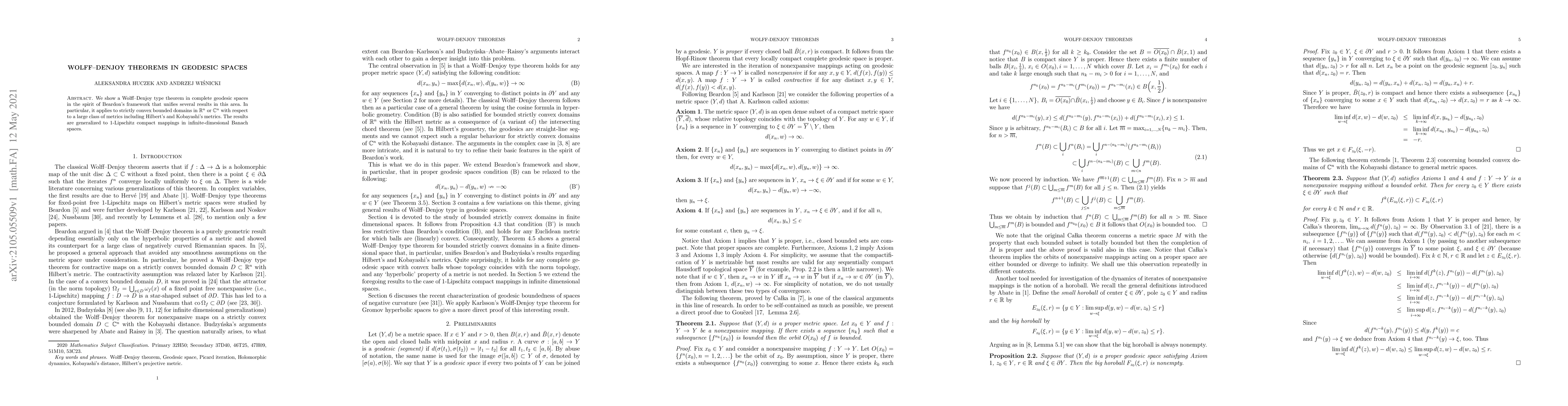 The research establishes a Wolff-Denjoy type theorem in complete geodesic spaces, generalizing results for strictly convex bounded domains in \(\mathbb{R}^n\) or \(\mathbb{C}^n\) with respect to various metrics, including Hilbert's and Kobayashi's metrics. The framework unifies several existing results and extends to 1-Lipschitz compact mappings in infinite-dimensional Banach spaces.