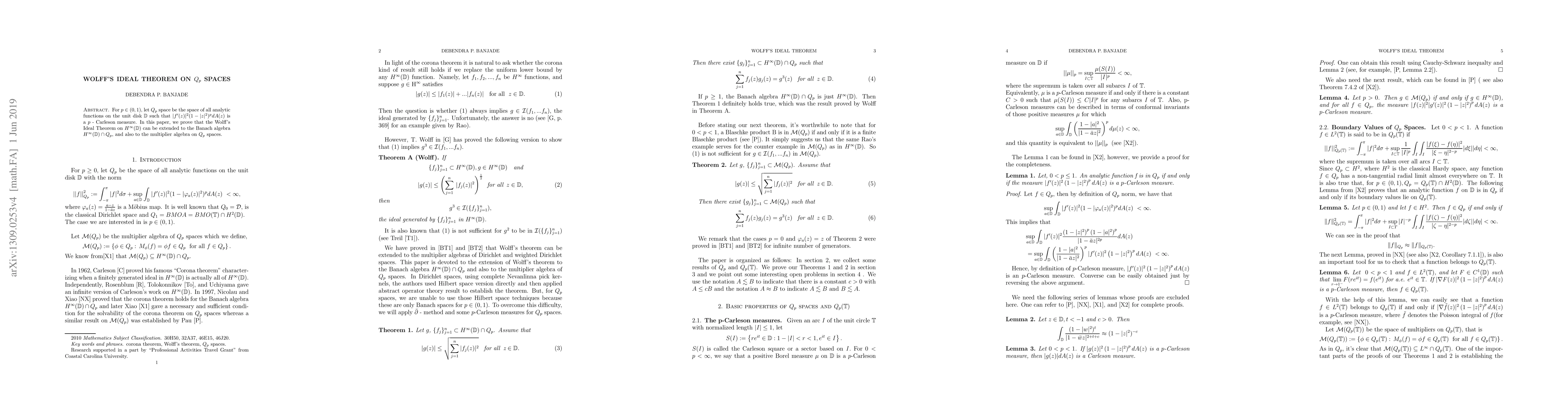This paper extends Wolff's Ideal Theorem to $H^{ ext{}}( ext{D}) ext{ extcap}Q_p$ spaces and their multiplier algebras, proving the theorem for a broader class of functions.