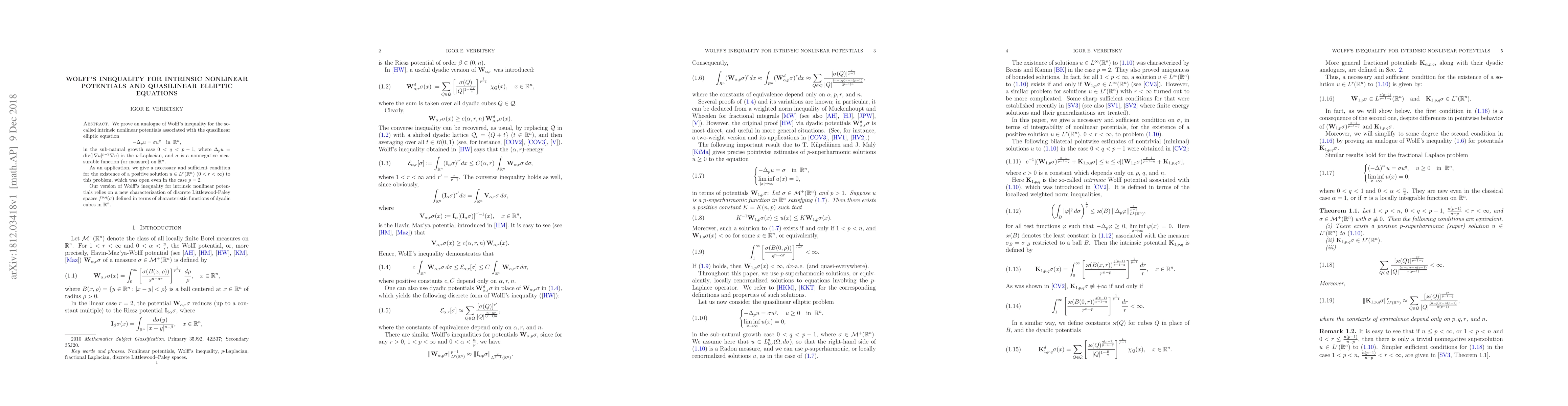 nonlinear potentials associated with the quasilinear elliptic equation \[