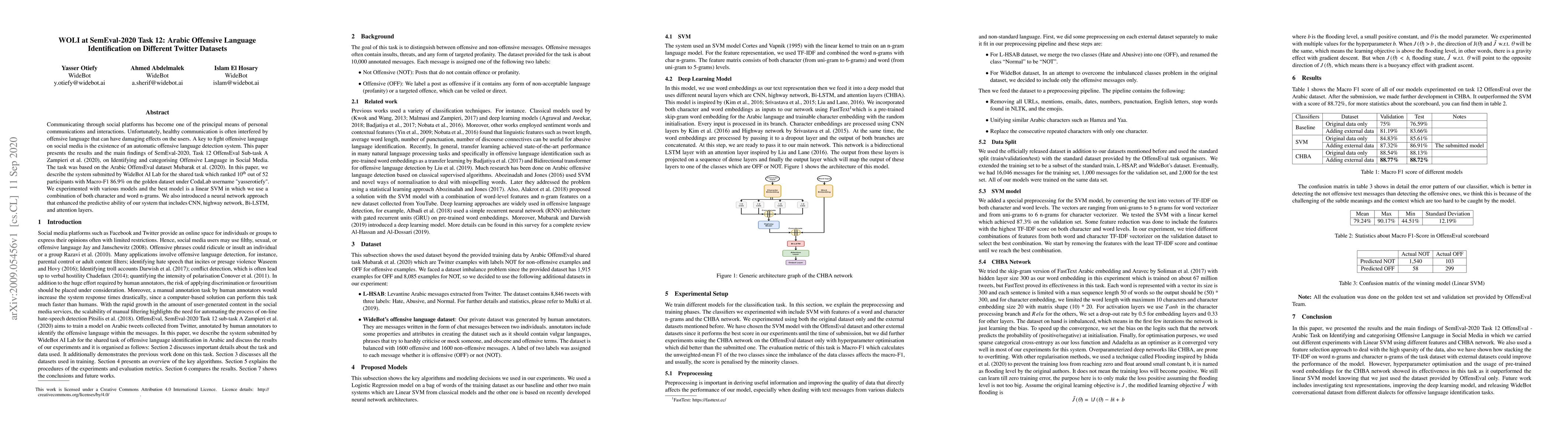 Communicating through social platforms has become one of the principal means of personal communications and interactions. Unfortunately, healthy communication is often interfered by offensive language that can have damaging effects on the users. A key to fight offensive language on social media is the existence of an automatic offensive language detection system. This paper presents the results and the main findings of SemEval-2020, Task 12 OffensEval Sub-task A Zampieri et al. (2020), on Identifying and categorising Offensive Language in Social Media. The task was based on the Arabic OffensEval dataset Mubarak et al. (2020). In this paper, we describe the system submitted by WideBot AI Lab for the shared task which ranked 10th out of 52 participants with Macro-F1 86.9% on the golden dataset under CodaLab username "yasserotiefy". We experimented with various models and the best model is a linear SVM in which we use a combination of both character and word n-grams. We also introduced a neural network approach that enhanced the predictive ability of our system that includes CNN, highway network, Bi-LSTM, and attention layers.