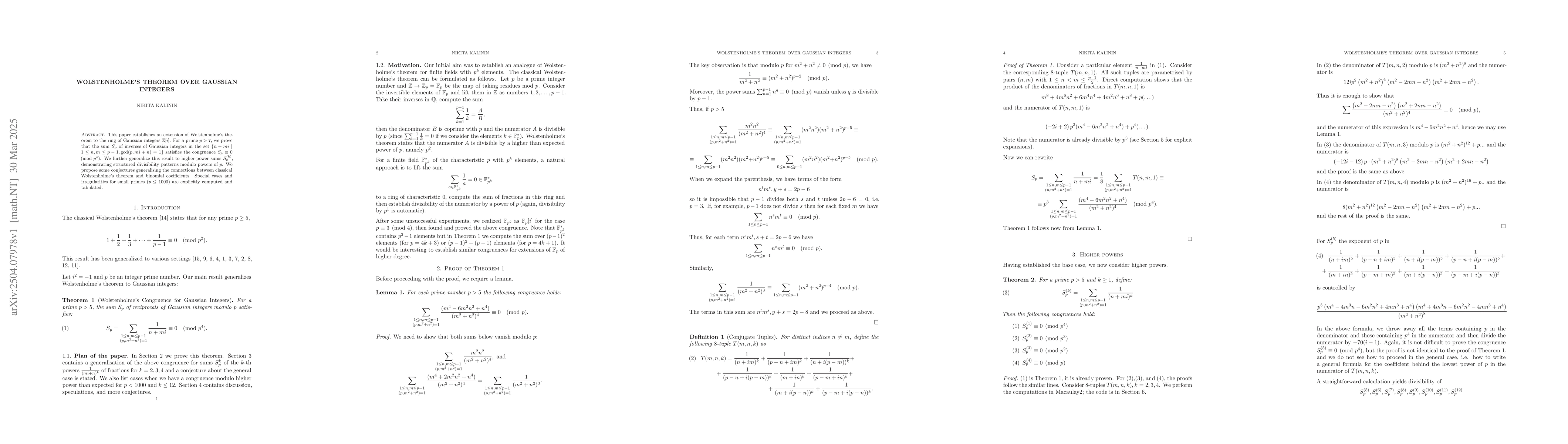 Researchers extend Wolstenholme's theorem to Gaussian integers, proving a congruence for sums of inverses modulo powers of p, with implications for connections between classical theorems and binomial coefficients.