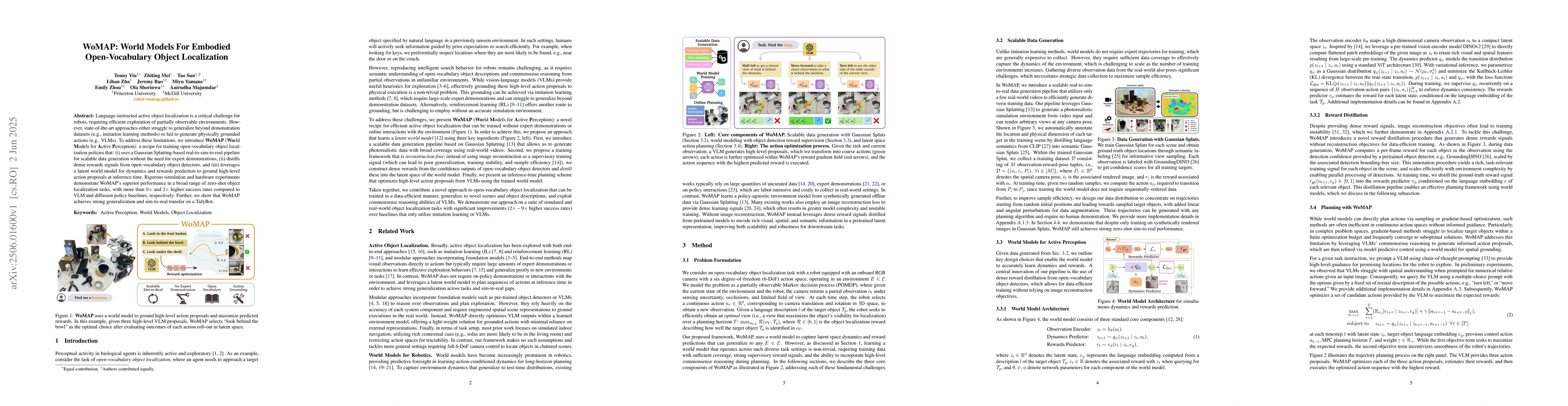 WoMAP improves robot object localization with a method that combines scalable data generation, dense reward signals, and a latent world model for physically grounded actions, outperforming existing methods.