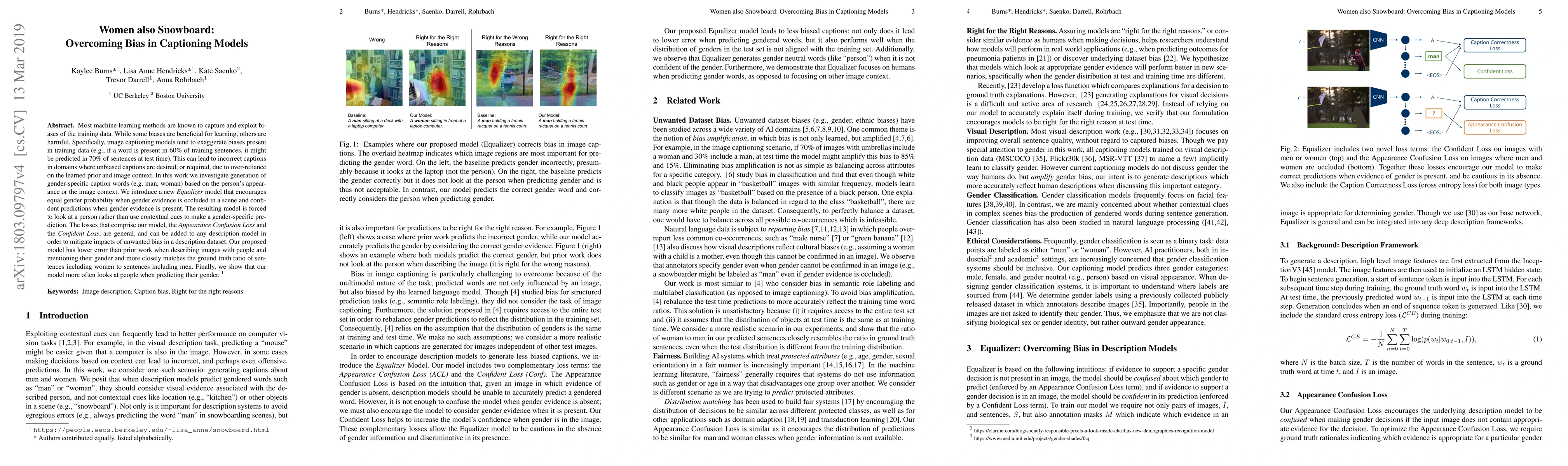 Most machine learning methods are known to capture and exploit biases of the training data. While some biases are beneficial for learning, others are harmful. Specifically, image captioning models tend to exaggerate biases present in training data (e.g., if a word is present in 60% of training sentences, it might be predicted in 70% of sentences at test time). This can lead to incorrect captions in domains where unbiased captions are desired, or required, due to over-reliance on the learned prior and image context. In this work we investigate generation of gender-specific caption words (e.g. man, woman) based on the person's appearance or the image context. We introduce a new Equalizer model that ensures equal gender probability when gender evidence is occluded in a scene and confident predictions when gender evidence is present. The resulting model is forced to look at a person rather than use contextual cues to make a gender-specific predictions. The losses that comprise our model, the Appearance Confusion Loss and the Confident Loss, are general, and can be added to any description model in order to mitigate impacts of unwanted bias in a description dataset. Our proposed model has lower error than prior work when describing images with people and mentioning their gender and more closely matches the ground truth ratio of sentences including women to sentences including men. We also show that unlike other approaches, our model is indeed more often looking at people when predicting their gender.