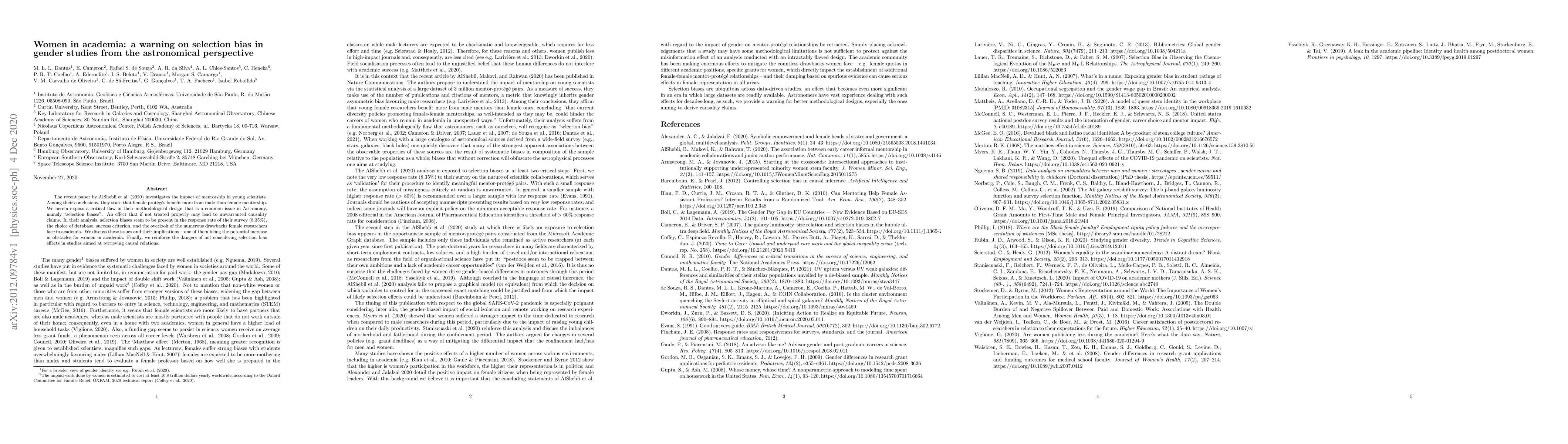 This paper critiques the methodology of AlShebli et al. (2020) on mentorship in young scientists, highlighting selection biases in their survey response rate, database choice, and success criteria. It warns of the dangers of unwarranted causality claims in gender studies due to these biases, emphasizing the potential increase in obstacles for women in academia.